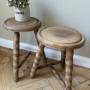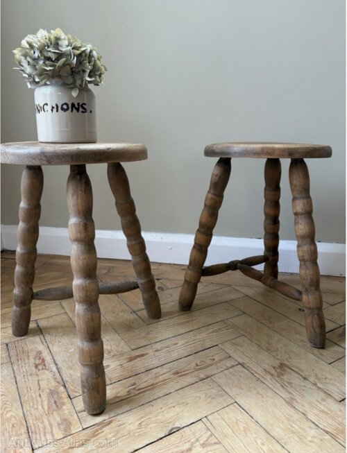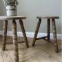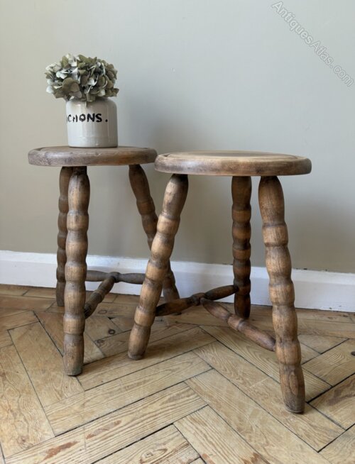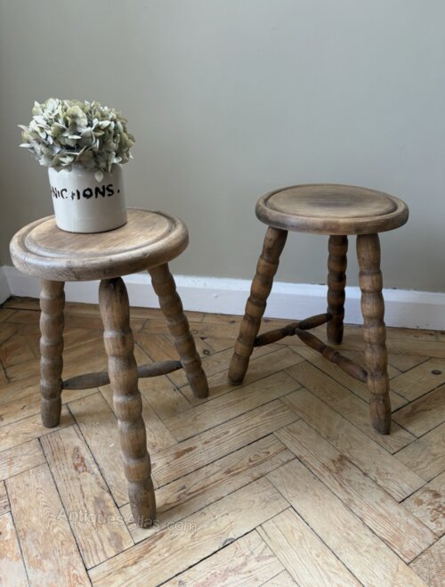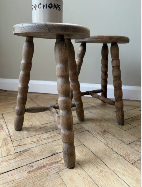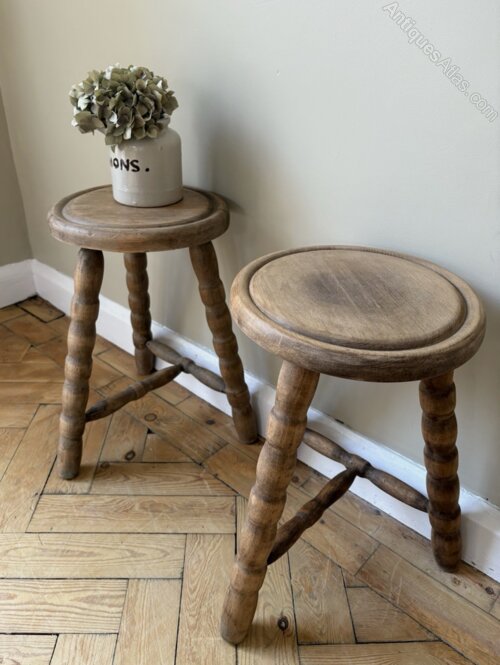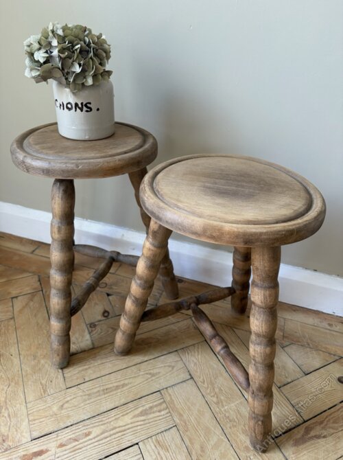A fabulous light rustic toned pair of French bobbin style stools. Great sturdy form in a beautifully weathered colour. An almost identical pair with a minimal height difference:Height:40 & 41cm, Width: 33cm, Depth: 30cm