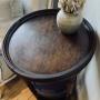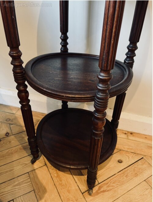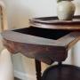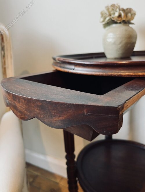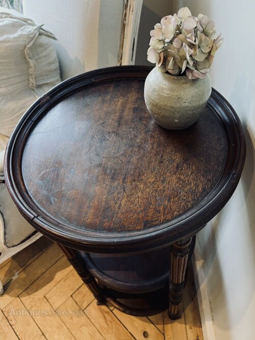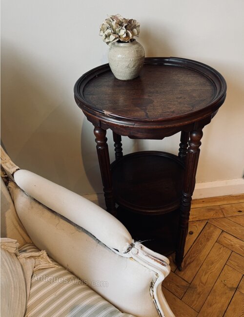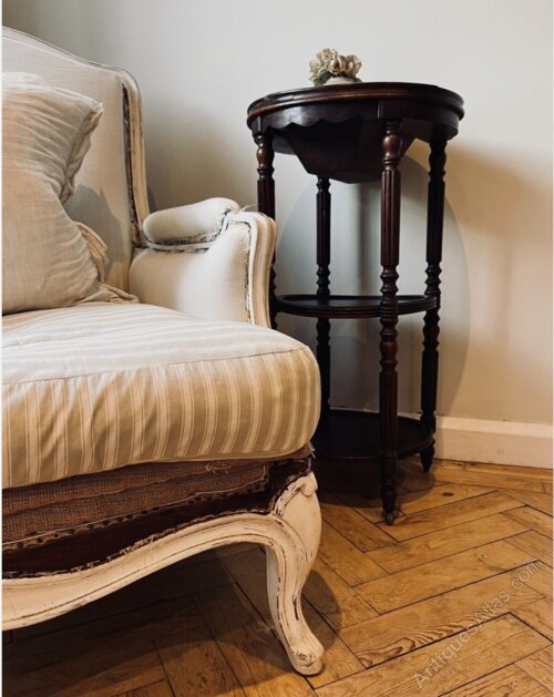 Lovely characterful French tiered side table in a dark mahogany finish. Solid with some fabulous classic details and charm. Original castors with deep sliding hidden drawer.It’s sturdy and well made albeit with a few bumps & bruises namely the damaged beading to the top and a few historic marks as shown. Albeit this circular beauty has great proportions to easily fit into any setting.