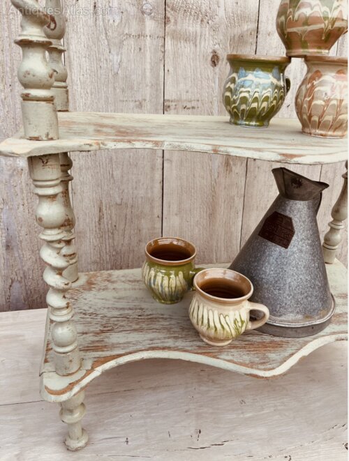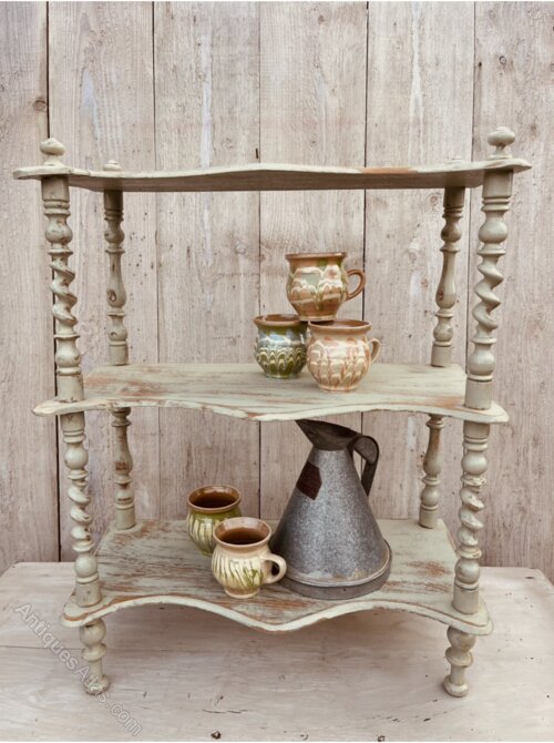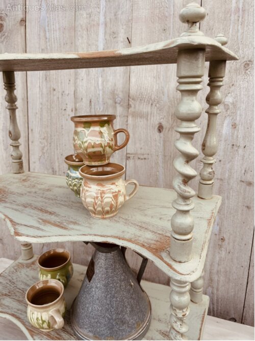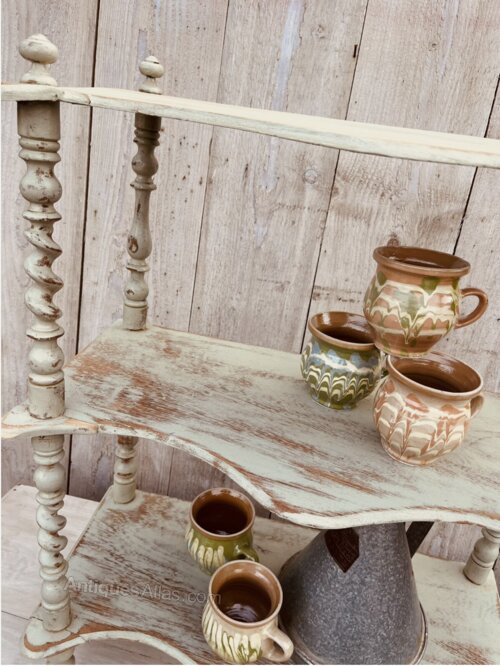 A Fabulous set of painted freestanding shelves with twisted detail over each of the spindles. Shapely curves on this beautiful old distressed piece.Great for a kitchen or dining room, maybe spices mugs etc. Pale green rustic paint finish with good sturdy form. Legs would be easily removed if you had ideas to wall mount this unique piece.