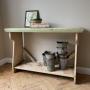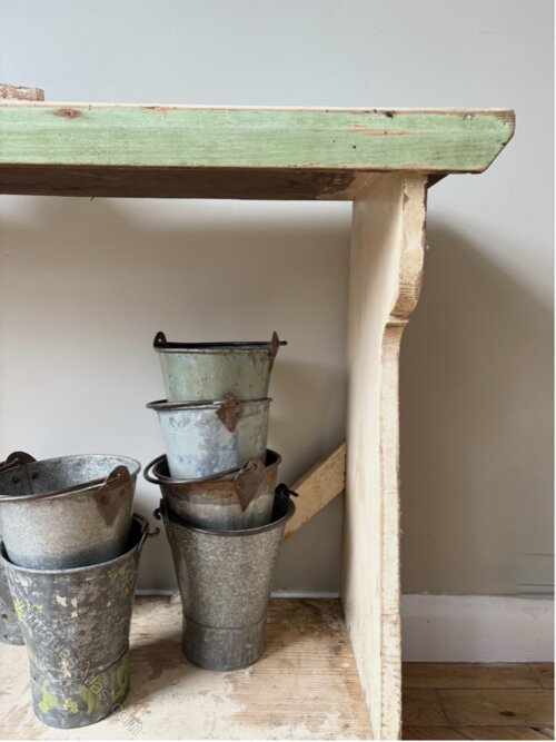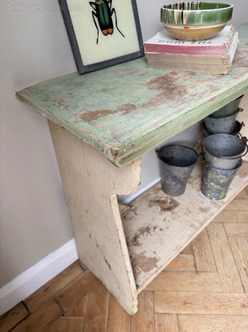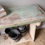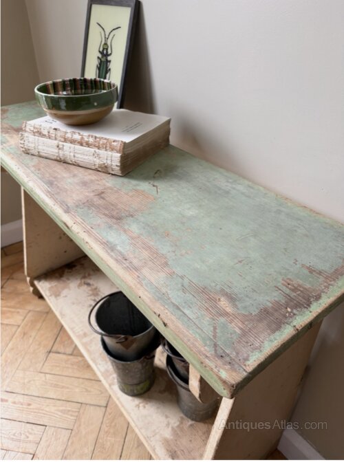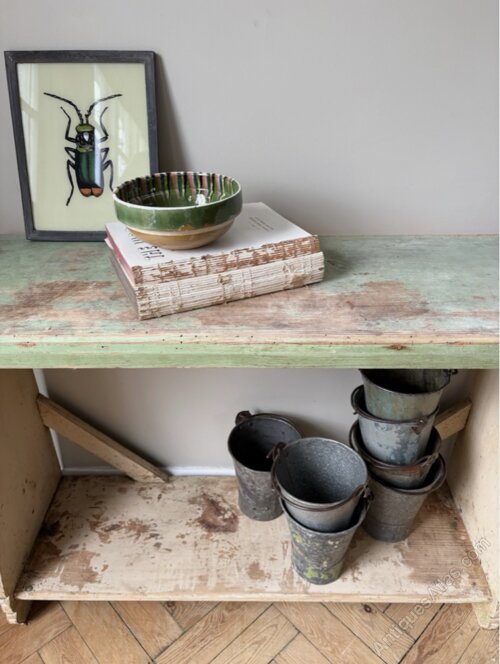 A vintage Hungarian bucket bench perfect for that boot room or hallway for storage , decoration or a blend of both. Fabulous worn cream paint over the body with a fabulous apple green distressed top. Knocks and scrapes throughout with some previously treated woodworm holes predominantly to the back and bottom shelf as expected for its age. The colours work effortlessly together and bring a pop of colour to neutral walls. Generous proportions top off this lovely country home essential.Height 67cm, Width 100cm, Depth 31cm