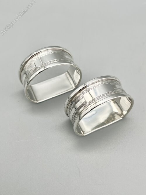 This is a stylish Pair of Vintage Sterling Silver Napkin Rings. The rings are D-shaped with two bands of engine turned decoration to either side of rectangular bank cartouches.The napkin rings were made in Birmingham by Henry Griffith & Sons and date to 1968. Henry Griffith founded his firm in Birmingham in the 1870s, becoming Henry Griffith & Sons around 1890. They specialised in silver jewellery, smoking accessories, thimbles and small personal items. In 1919 they relocated to nearby Leamington Spa in Warwickshire and remained in business until at least the late 1970s.