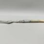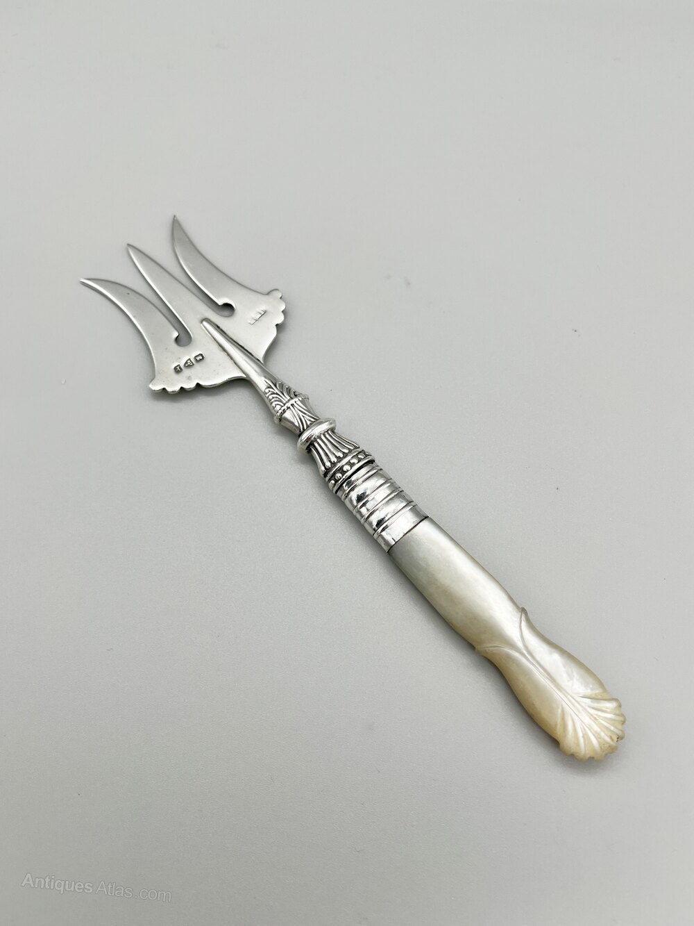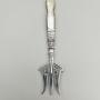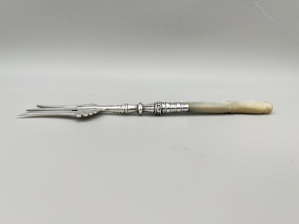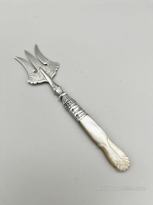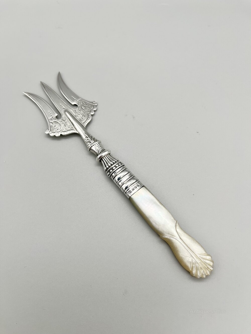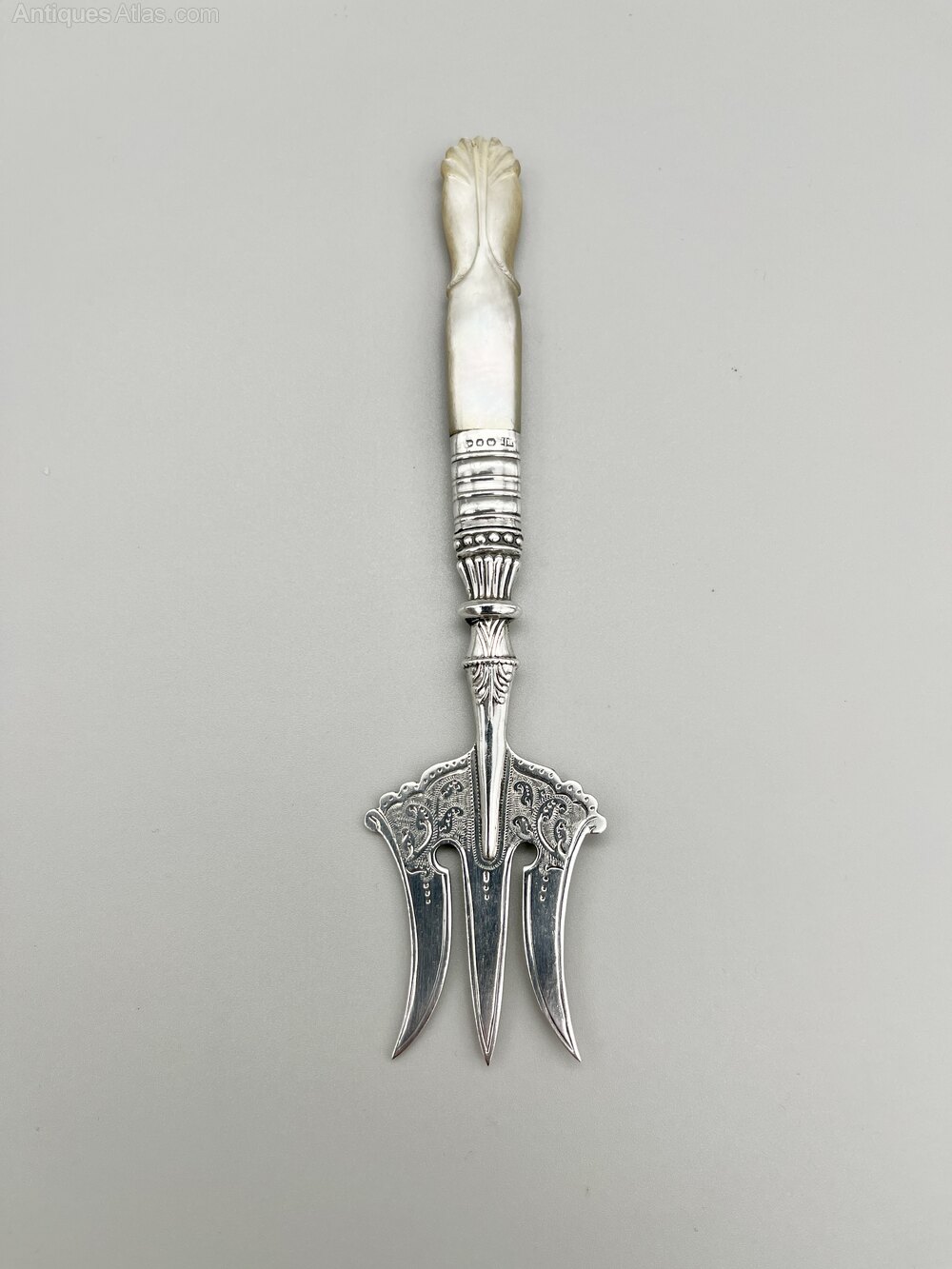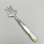This is an ornate late Victorian Sterling Silver Muffin Fork with a Mother of Pearl handle. The head of the fork is engraved on the upper side with a foliate pattern whilst the shaft has reeded and beaded decoration. The mother of pearl handle is carved into a fan shape at the end.English muffins are traditionally torn in half with a muffin fork rather than neatly cut with a bread knife. This retains the rough interior texture which goes extra crispy when toasted.