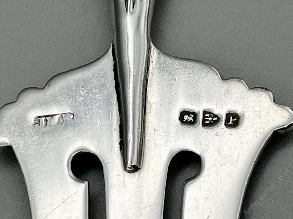 The hallmarks, on the underside of the head, are a little rubbed but still clear to read. They show the lion passant for Sterling Silver, the sword and three wheatsheaves assay mark for Chester, the date letter P for 1898 and the J.M.B makers' mark for John Millward Banks.
