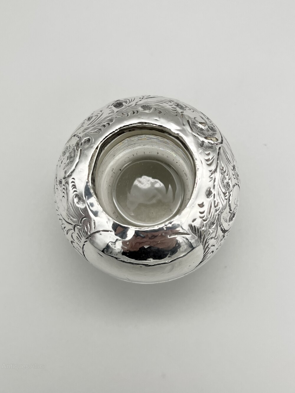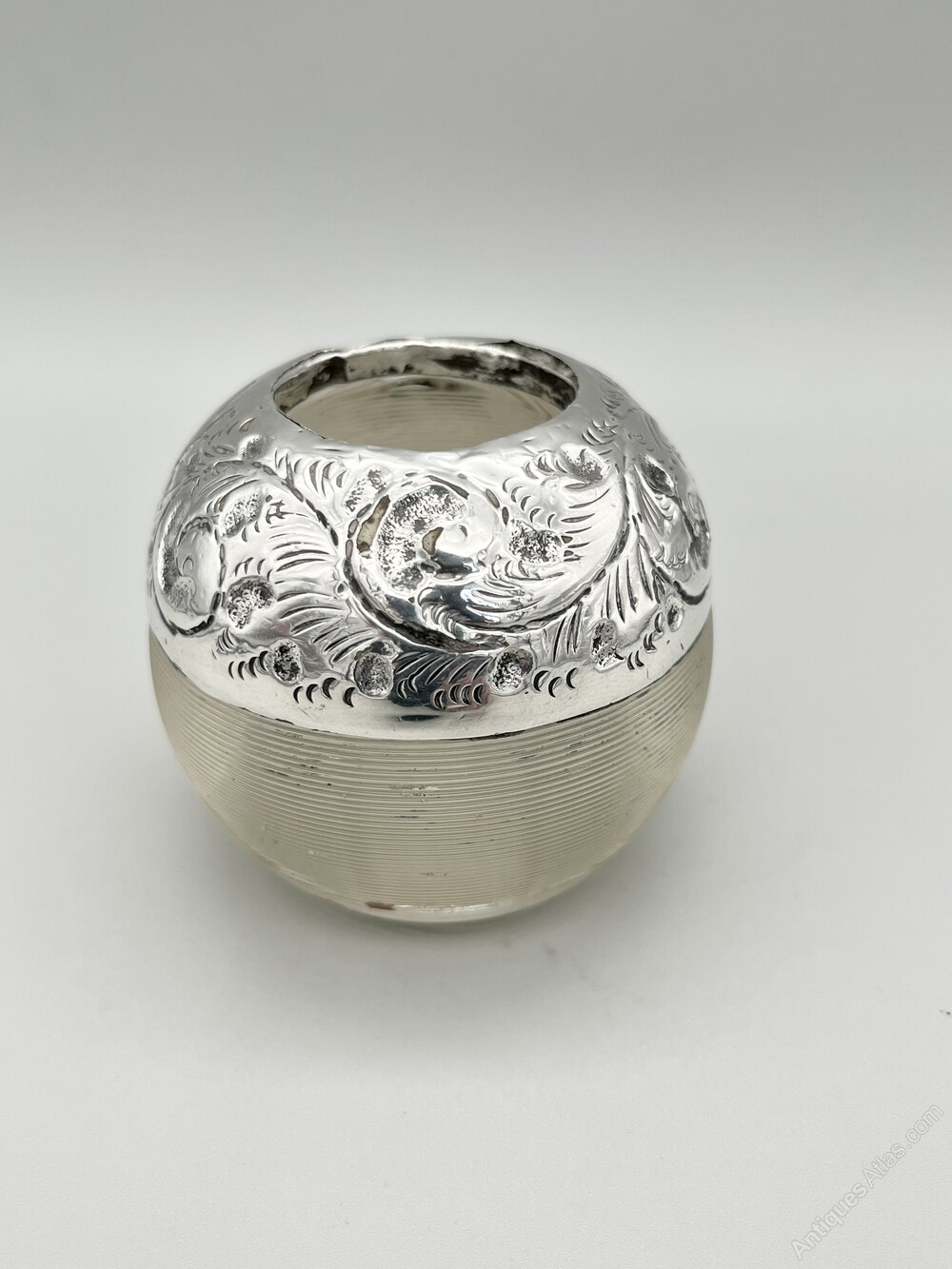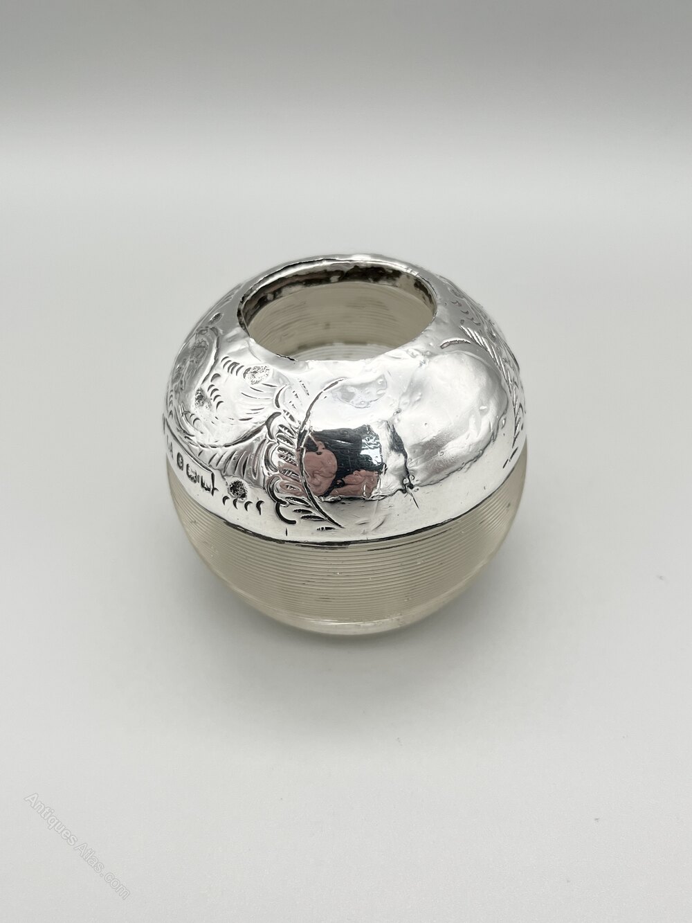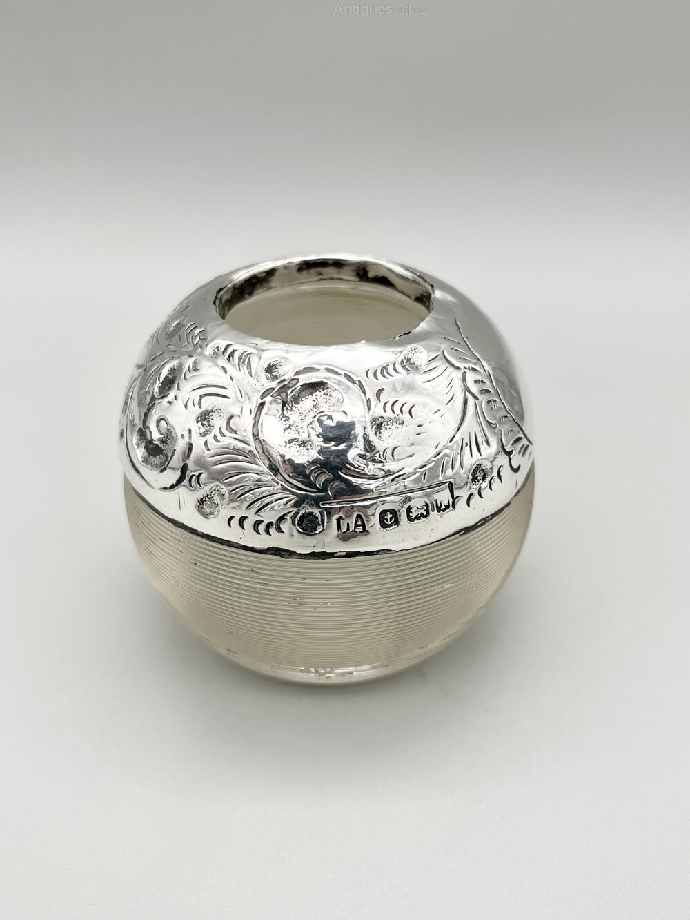 Here we have a good quality Edwardian Glass and Sterling Silver Lucifer or Match Striker. The lucifer is spherical with a flat base. The lower half of the body is ribbed to strike matches on and the upper part is covered by a deep silver collar with engraved acanthus leaf decoration around a blank cartouche at the front. There is a central well to hold the matches.The lucifer was made in Birmingham by or for Louis Adler and dates to 1908. Louis Adler was active in the early years of the 20th century. Primarily a tobacconist his mark is seen on silver mounts on pipes, cigarette holders, vesta cases, matchbox covers and lucifers throughout the Edwardian era.