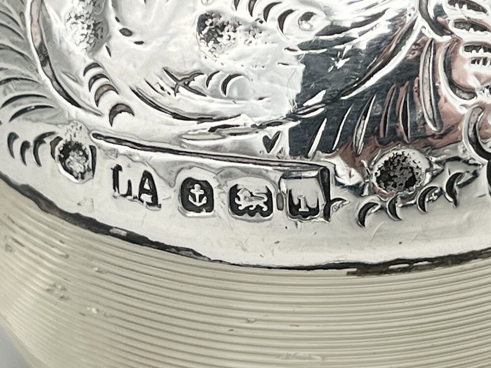 The hallmarks, to the left of the cartouche, are a little rubbed but still clear to read. They show the lion passant for Sterling Silver, the anchor assay mark for Birmingham the date letter i for 1908 and the L A sponsors' mark for Louis Adler.