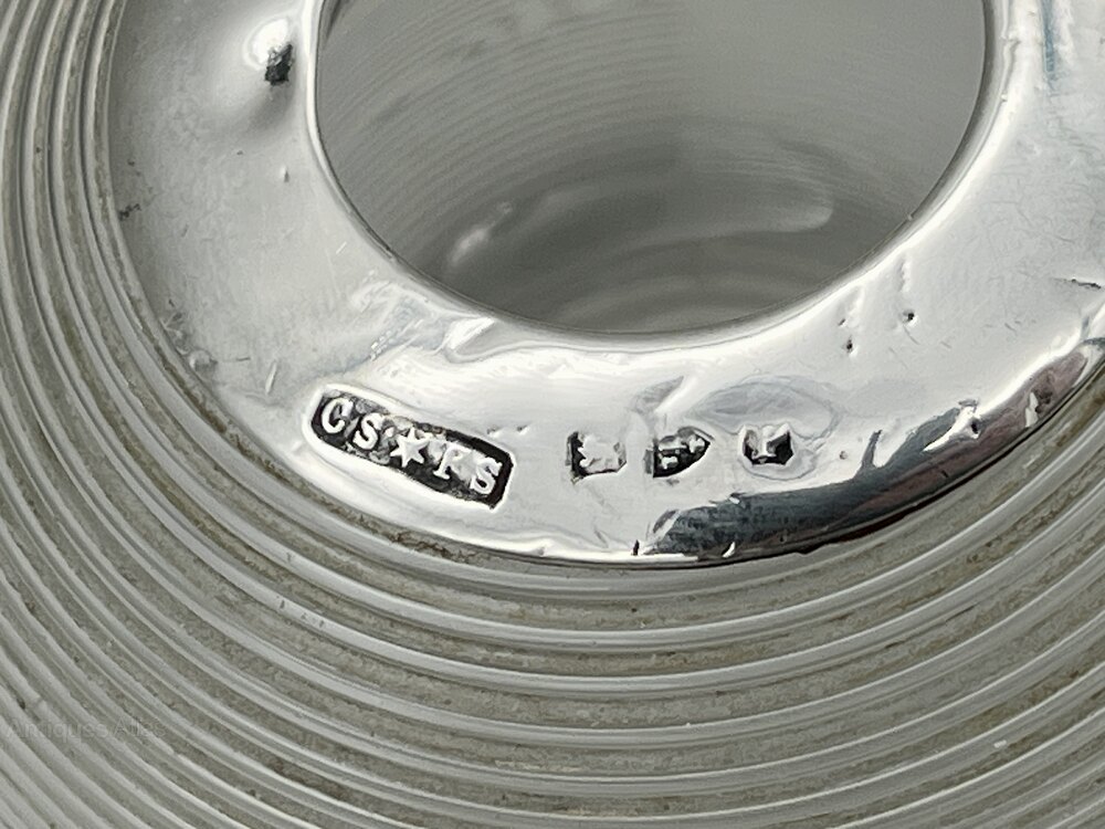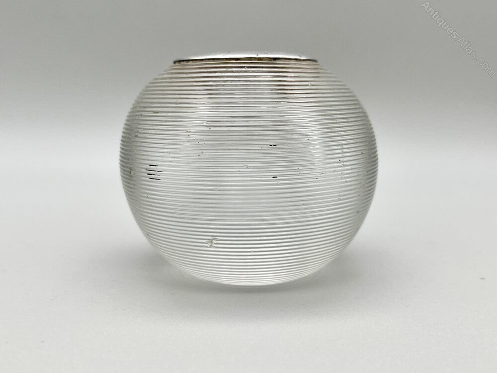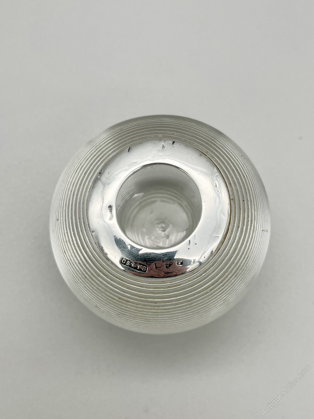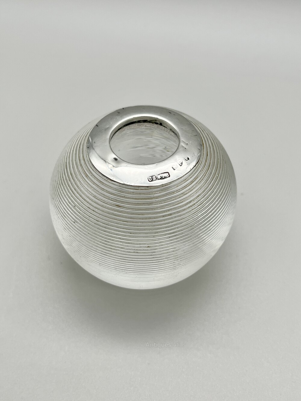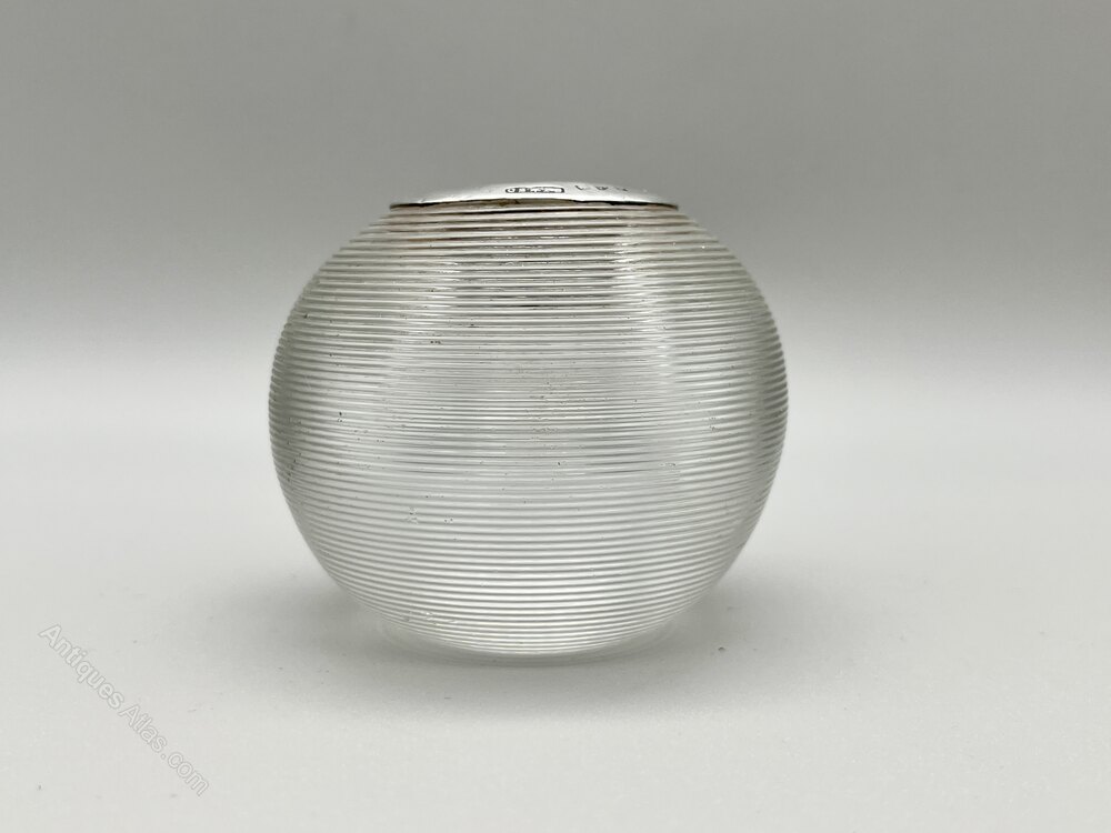 This is a high quality late Victorian Glass and Sterling Silver Lucifer or Match Striker. The spherical glass body has a flat base and concentric ribs on which to strike vesta style matches. The central well for holding the matches is surrounded by a plain silver collar.The lucifer was made by Saunders & Shepherd and assayed in Chester in 1898. Cornelius Saunders and Frank Shepherd began their partnership in London’s Holborn Circus district in 1878. This was a major centre for silversmiths, goldsmiths and jewellers for many years in the 19th and 20th centuries. The firm were both manufacturers and retailers, specialising in small silver items for personal or domestic use and registered marks in London, Birmingham, Chester and Sheffield. The company remained in business up until the late 1930s.