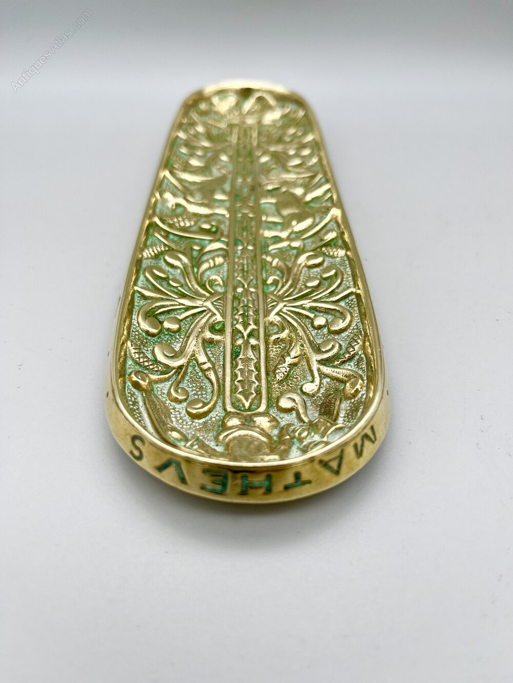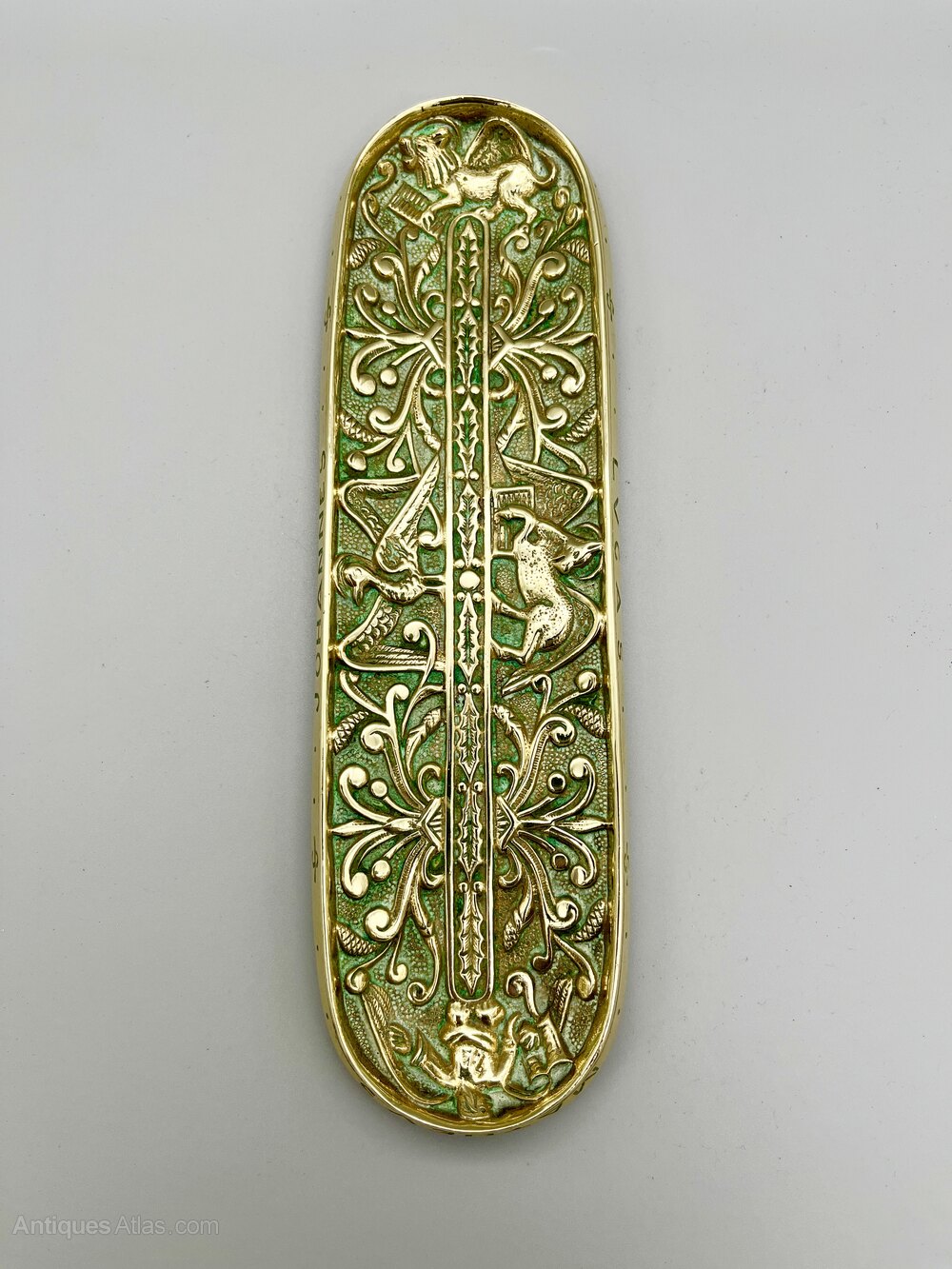 This is a handsome, heavyweight Victorian Brass Pen Tray. The pen tray is oblong with rounded ends and stands on four square feet. Around the rim are the names of the four evangelists in Latin: Mathevs (Matthew), Johannes (John), Marcvs (Mark) and Lvcas (Luke). Their corresponding symbols are on the inside of the tray next to their names: Angel (Matthew), Eagle (John), Lion (Mark) and Ox (Luke).The pen tray was made in Birmingham by renowned metalworkers William Tonks & Sons and dates to around the 1880s/90s. William Tonks established his business in Birmingham around 1790. The firm started out producing screws but soon augmented their range to include household fixtures and fittings, military campaign hardware and ecclesiastical pieces. They exhibited at the Great Exhibition in 1851 and in the 1860s began to develop a range of art metalware. The company went through various mergers during the 20th century and are now a subsidiary of the Ingersoll-Rand group.