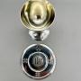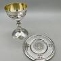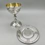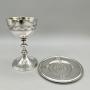 The chalice is 9.5cm / 3.75ins high and 5.7cm / 2.25ins in diameter, whilst the paten is 8.9cm / 3.5ins in diameter. The set weighs in at a substantial 143.5g / 5oz / 4.6toz of solid Sterling Silver.