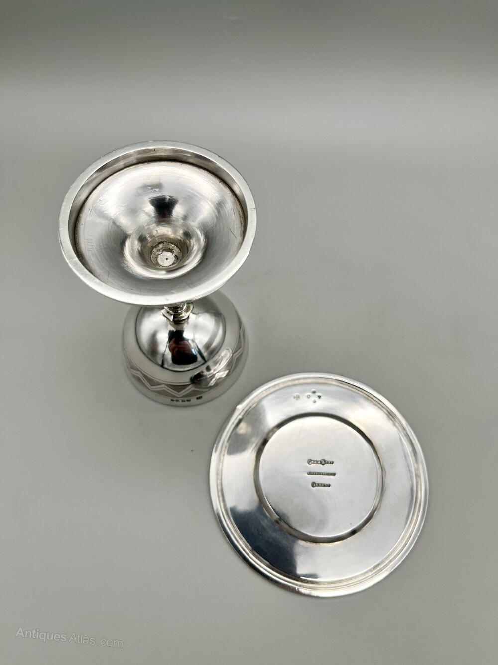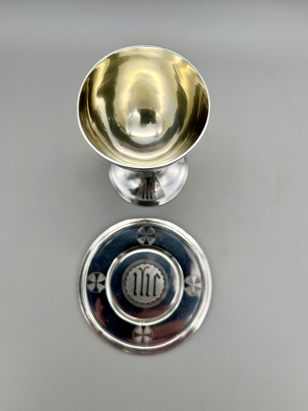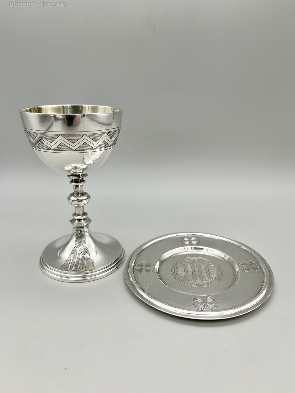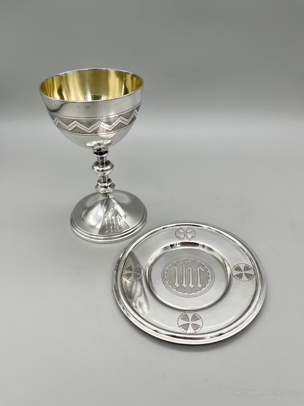 Here we have an exquisite, high quality Victorian Sterling Silver Communion Set. The set comprises a chalice and a paten. The chalice has a circular base with the IHS monogram, a knopped stem and a band of geometric decoration around the bowl. The interior is gilded. The paten is circular with the IHS monogram in the middle and four celtic style crosses at the compass points.The set was made in London by renowned ecclesiastical suppliers Cox & Sons and dates to 1877. The firm was founded by Thomas Cox in 1838, initially as ecclesiastical tailors. They became Cox & Sons in 1853 and the firm expanded to be suppliers of stained glass, ecclesiastical furniture, statuary and church supplies in general. They were based in Southampton Street in London’s Covent Garden district. The company was bought in 1880 and again in the mid-1890s but continued to trade until around 1935.