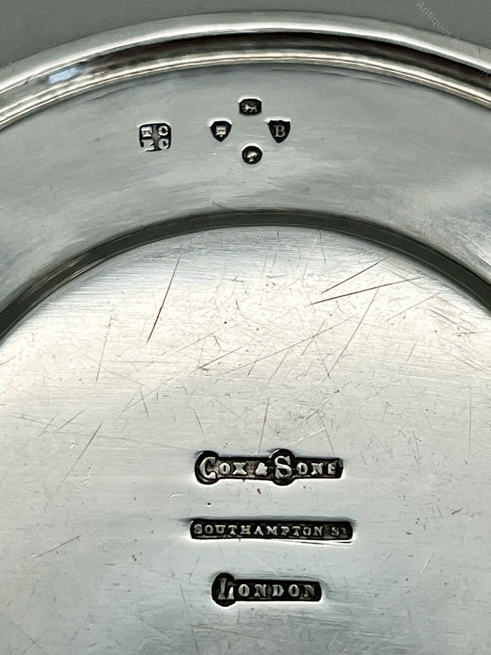 The hallmarks, on the outside of the bowl of the chalice and the underside of the paten are nice and clear to read. They show the lion passant for Sterling Silver, the leopard's head assay mark for London, the date letter B for 1877, the Queen Victoria duty mark and the T C over E C makers' mark for Thomas Cox and Edward Cox of Cox & Sons. The paten also has the retail stamp for Cox & Sons, Southampton Street, London.