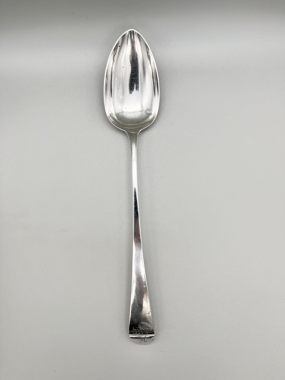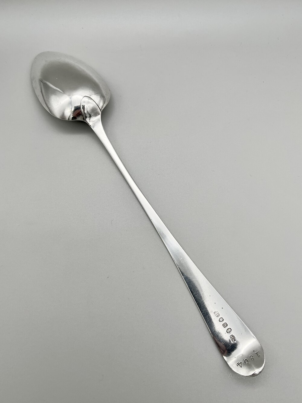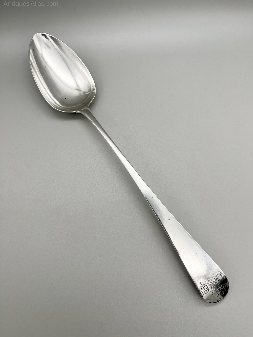 The basting spoon is of substantial size at 30.5cm / 12ins in length and 5.5cm / 2.2ins wide across the bowl. It weighs in at a very respectable 93.5g / 3.3oz / 3toz of solid Sterling Silver.