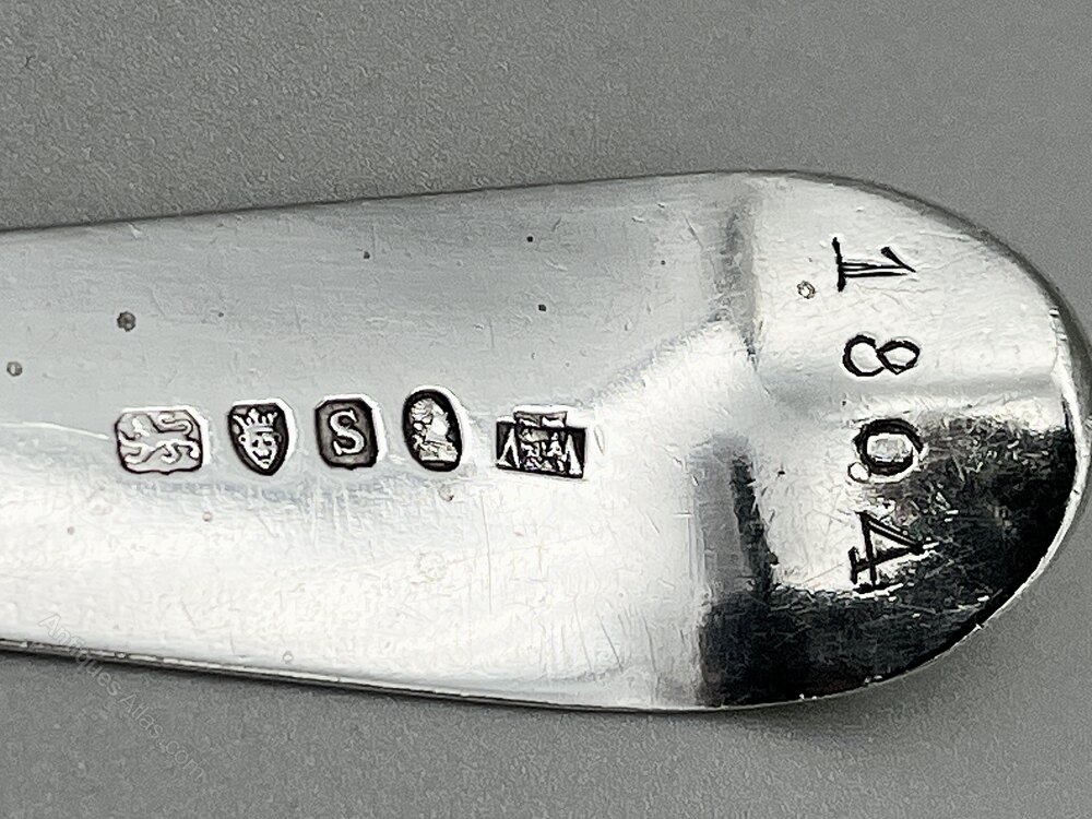 The hallmarks, on the underside of the stem, are nice and clear to read. They show the lion passant for Sterling Silver, the crowned leopard's head assay mark for London, the date letter s for 1793, the George III duty mark and the P B over A B makers' mark for Peter & Ann Bateman which is partially overstruck by the W.W makers' mark for William Williams II.