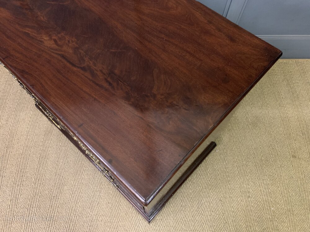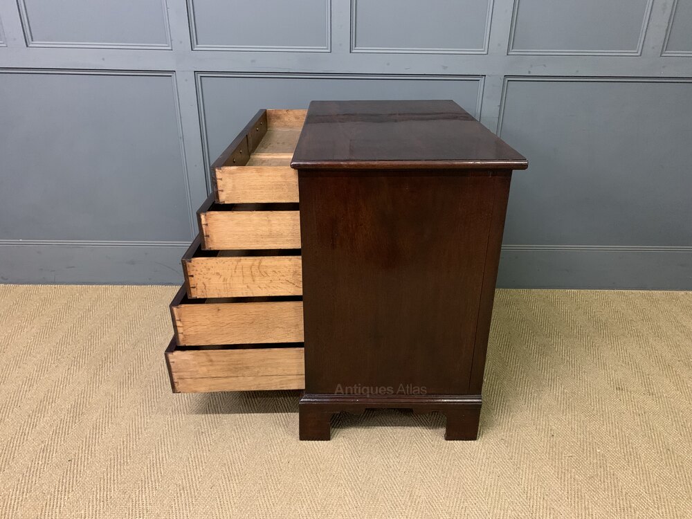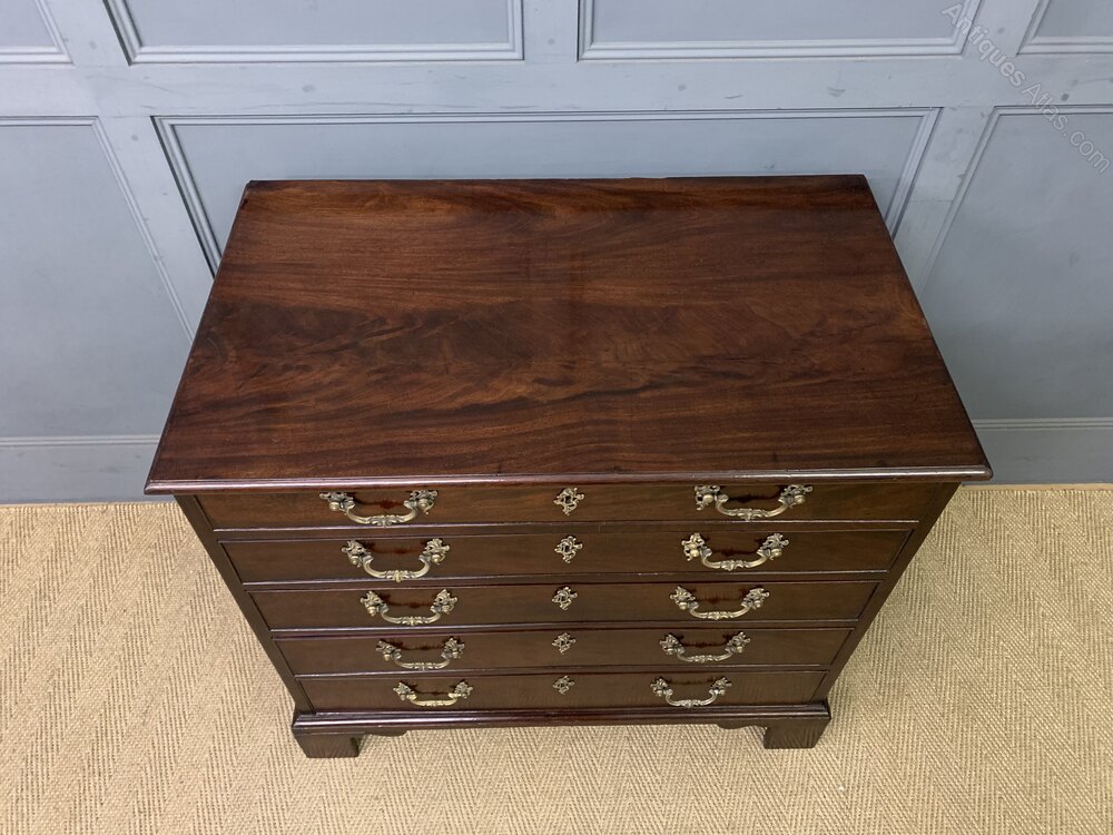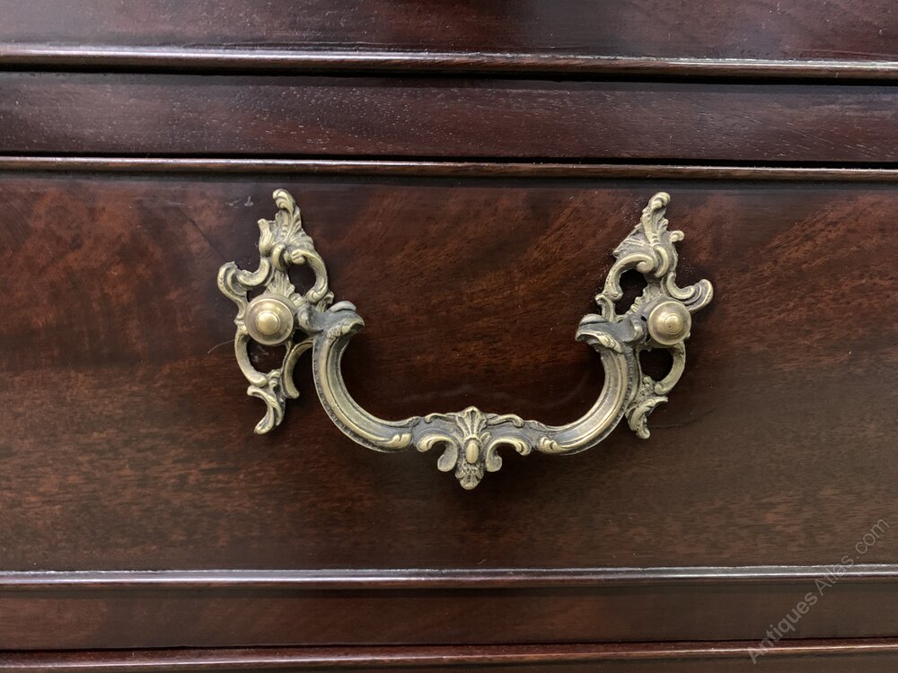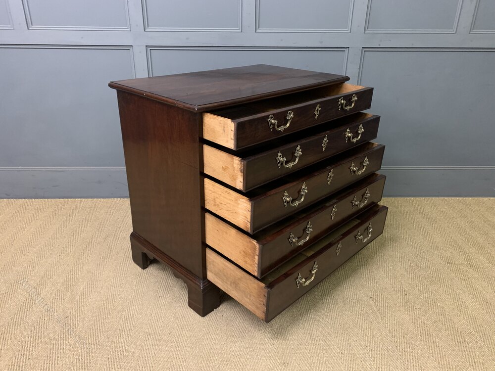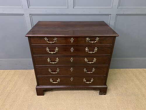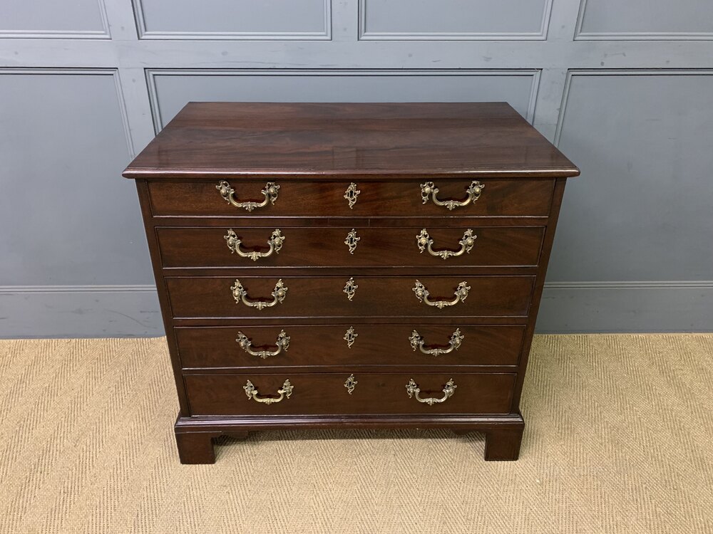 A lovely George III period mahogany chest of drawers. Very well constructed in mahogany with oak drawer linings. With a series of 5 graduated drawers all fitted with attractive solid brass rococo style hardware. All standing on bracket feet. Cleaned and waxed in our workshops and offered for sale in very good condition.Width 92cms