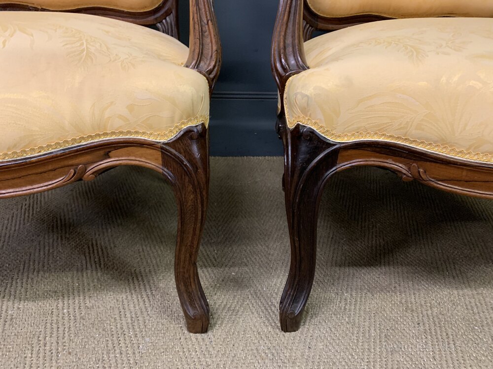 A lovely pair of late 19th century French rosewood fauteuils, or armchairs. Very well constructed in solid rosewood with carved crests to the top rails. With shaped , scrolling arms and legs. Professionally upholstered in a splendid yellow/gold fabric. Of generous proportions and very comfortable. Offered for sale in excellent condition (including the upholstery) ready to go straight into the home.Dimensions: