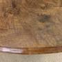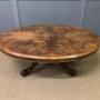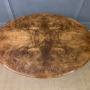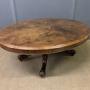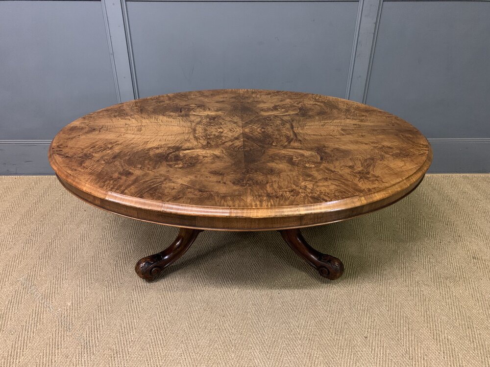 An attractive mid-Victorian period burr walnut coffee table. Of oval form and of generous proportions. Very well constructed in solid walnut with stunning burr walnut veneers. The quadraform base terminates in original brass and ceramic castors. Sympathetically repolished and now offered for sale in excellent condition, ready to go straight into the home. Splits into 2 sections for ease of installation.Dimensions: