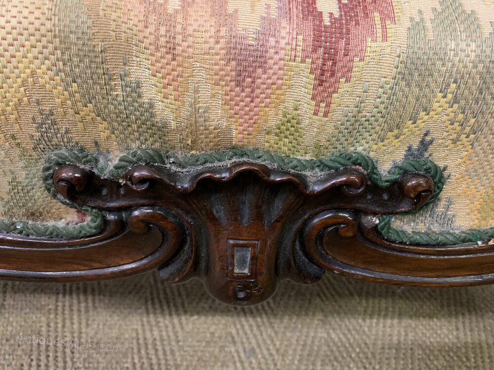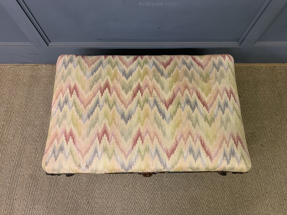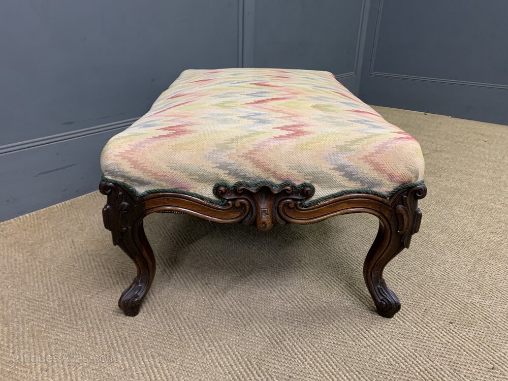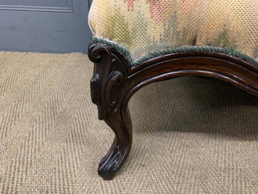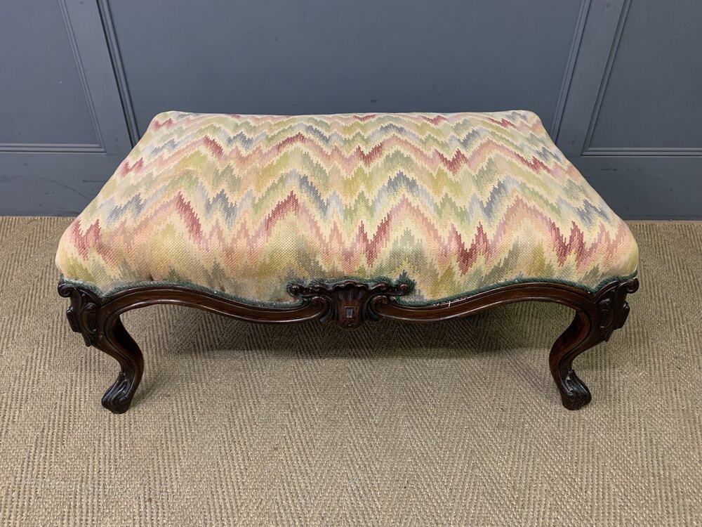 A lovely mid-Victorian period large scale foot stool. Well constructed in solid rosewood , with carved detailing throughout. Offered for sale in very good original condition. The upholtstery is also in very good order.Dimensions: