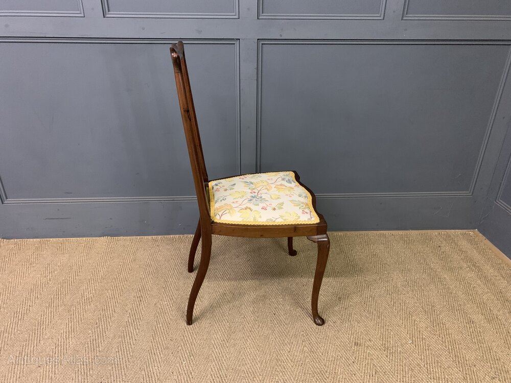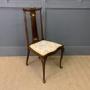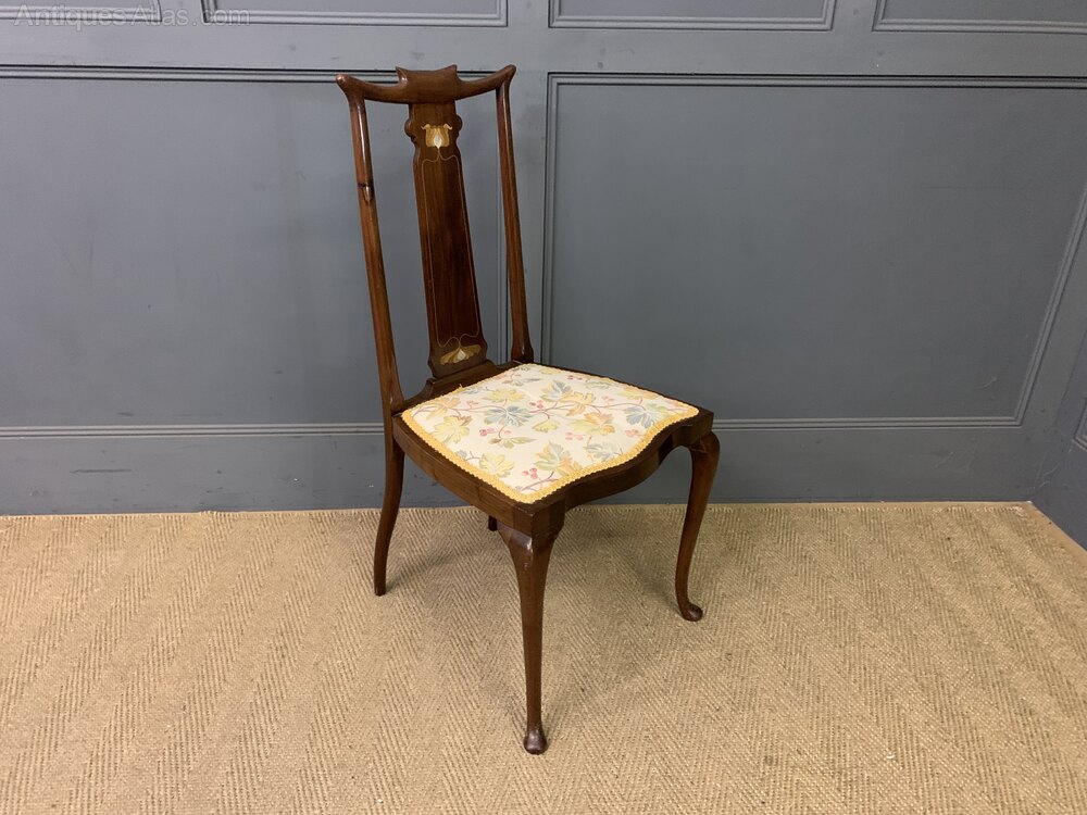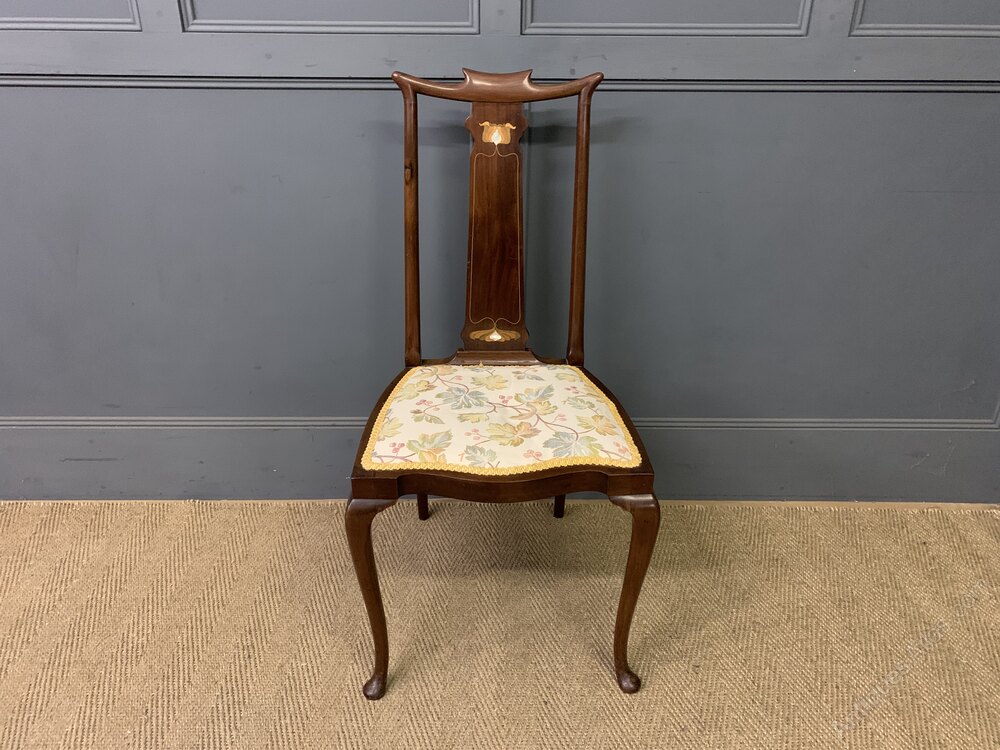 A lovely Art Nouveau period inlaid mahogany chair. Well constructed in solid mahogany and inlaid with stylised floral motiffs in boxwood, satinwood and mother of pearl. Would sit well within a number of different room scenarios within the modern home. Offered for sale in very good original condition.Dimensions: