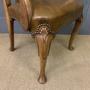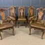 A very good set of early 20th century dining chairs in the Queen Anne style by Waring & Gillow. Well constructed in solid walnut with attractive burr walnut veneers. The high backs with vase shaped splats and adorned with crisply carved crests. The cabriole front legs with carved shell motifs to the knees and terminating in pad feet. Well upholstered in sumptuous brown leather finished with brass studs. Cleaned and waxed in our workshops and now offered for sale in very good original condition. Some fading to the backs. All chairs with a registration marks to the underside and one of the armchairs bearing the makers label.Dimensions