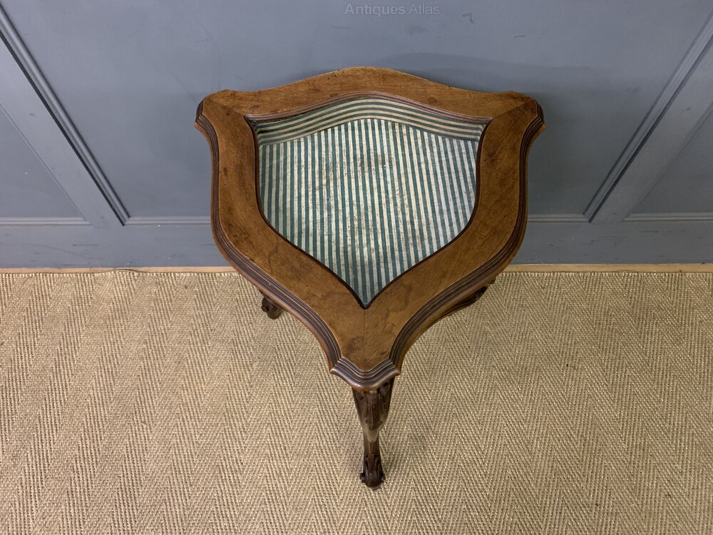 A charming late 19th century French bijouterie table. Well constructed in solid walnut and decorated with crisply carved detailings throughout. Of triangular shape and standing on elegant cabriole legs. With a glazed top that opens to access display space with original lining (some marks to this). Cleaned and waxed in our workshops and offered for sale in very good original condition.Dimensions: