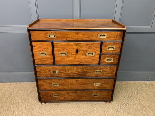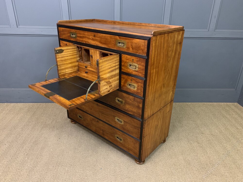 A very fine example of a mid 19th century military chest of drawers. Of colonial origin, most likely Anglo-Indian and dating to 1830-1840. Of excellent construction is solid camphorwood and finished with ebony moldings. Fitted with original solid brass recessed handles. Splits into 2 sections for ease of installation. The top section with a secretaire drawer flanked by shorter drawers and with a long drawer above. The bottom section with 3 long drawers. All drawers are lockable (key supplied). The secretaire drawer opens to reveal a fitted interior , complete with a sumptuous black leather writing surface. To the top is a gallery (detachable) and the whole chest stands on turned bun feet. This chest exudes charm and colonial elegance. Sympathetically refinished in our workshops and now offered for sale in excellent condition, ready to go straight into the home.Dimensions: