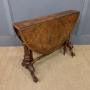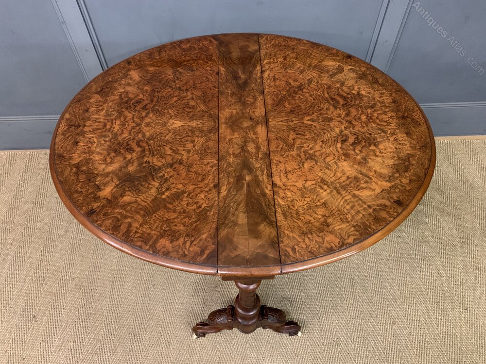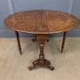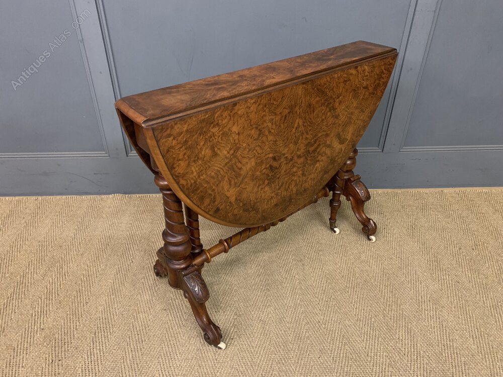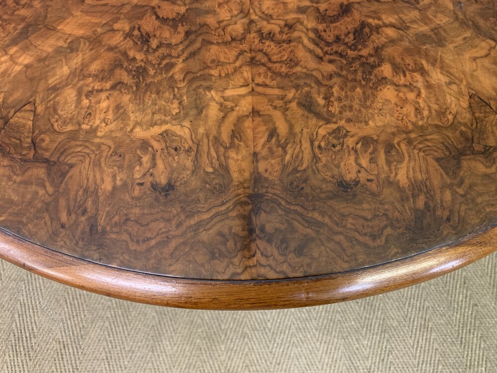 A large sized Victorian burr walnut Sutherland table. Of excellent construction in solid walnut with attractive burr walnut veneers. The flaps lift up into place and supported by swing-out legs. The frame is in solid walnut with the legs terminating in original brass and ceramic castors. The top has been sympathetically repolished in our workshops and the table is now offered for sale in excellent condition, ready to go straight into the home.Dimensions: