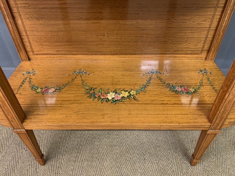 A very pretty early 20th century period inlaid satinwood side table. Very well constructed in attractive satinwood veneers onto a solid mahogany carcas and with solid oak drawer linings. Embellished with ebony stringing inlay and satinwood cross banding throughout. Further decorated with lovely hand painted floral swags and garlands. With a single drawer to the front and with convex ends. Surmounted by the original solid brass gallery. All standing on square tapering legs which terminate in spade feet and are united by an under-tier. This table is of good proportions and would sit well in a number of different room scenarios within the modern home. Cleaned and waxed in our workshops and now offered for sale in very good condition with a great colour and patina.Dimensions: