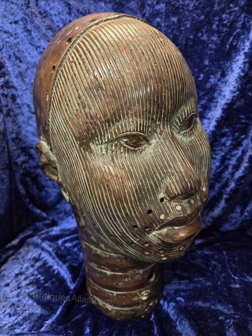 Vintage bronze sculpture, contemporary reproduction of a female Benin visage, the famous Ife statues. 20th century. In excellent condition. No damage or restoration. Height 34cm. Width 15cm.DateRetro