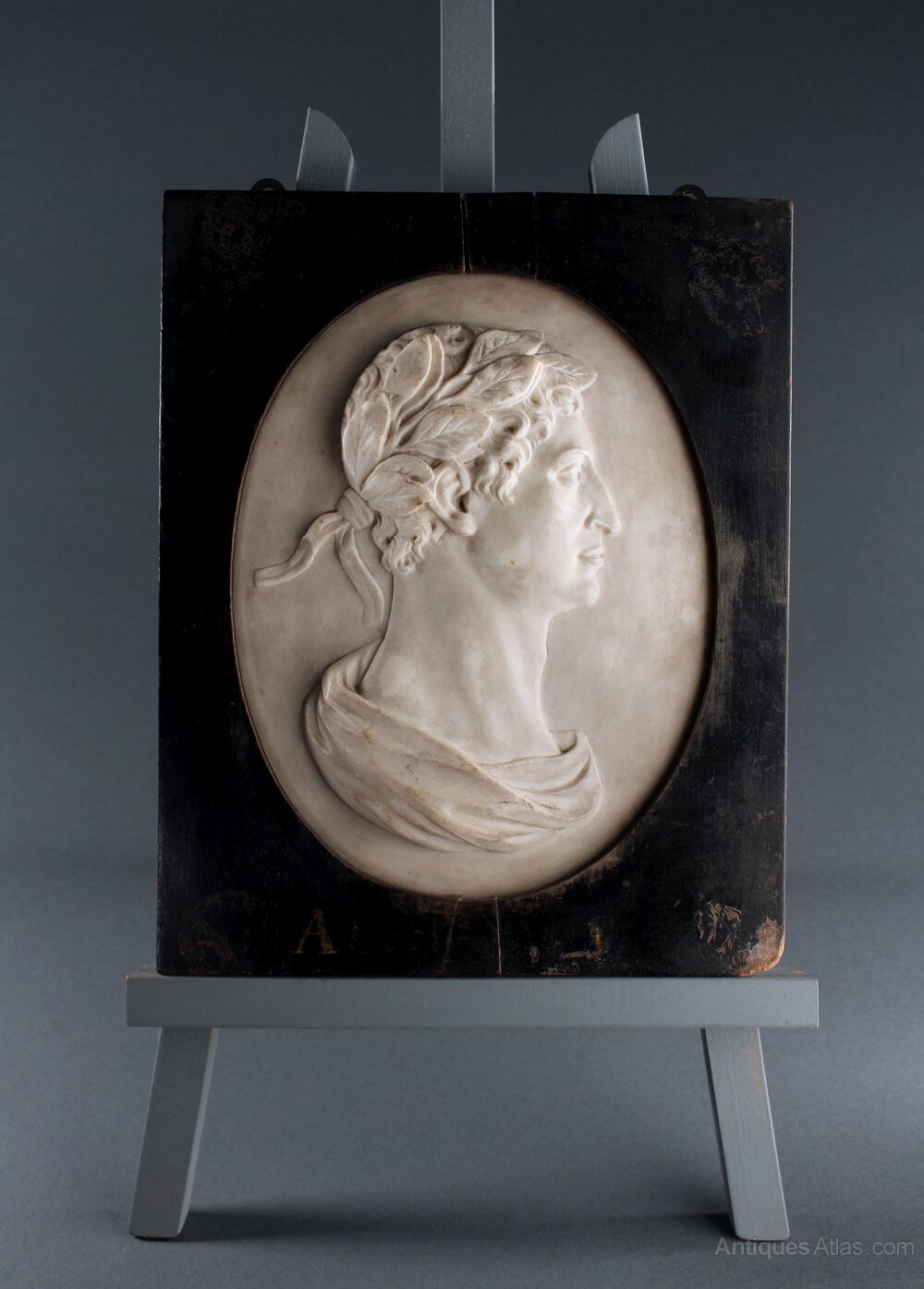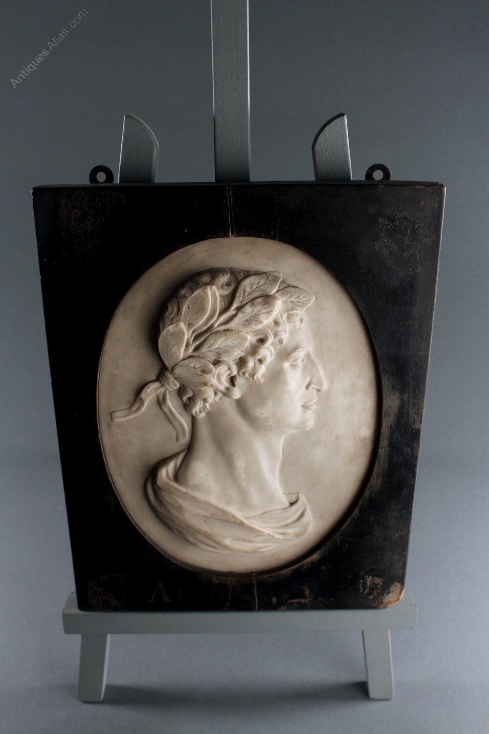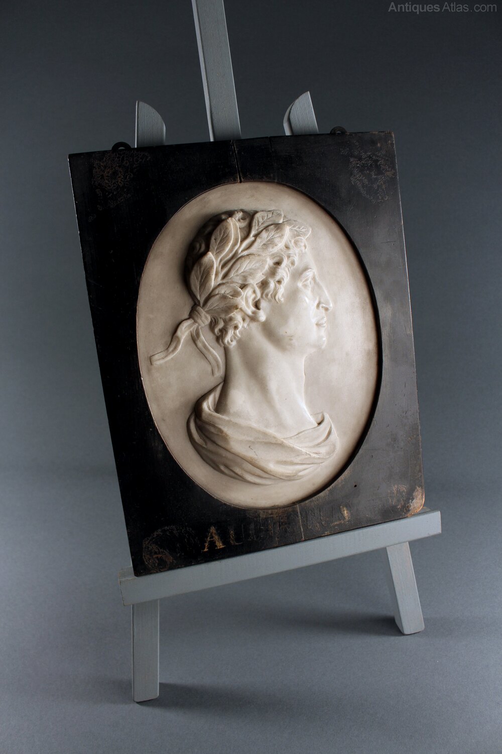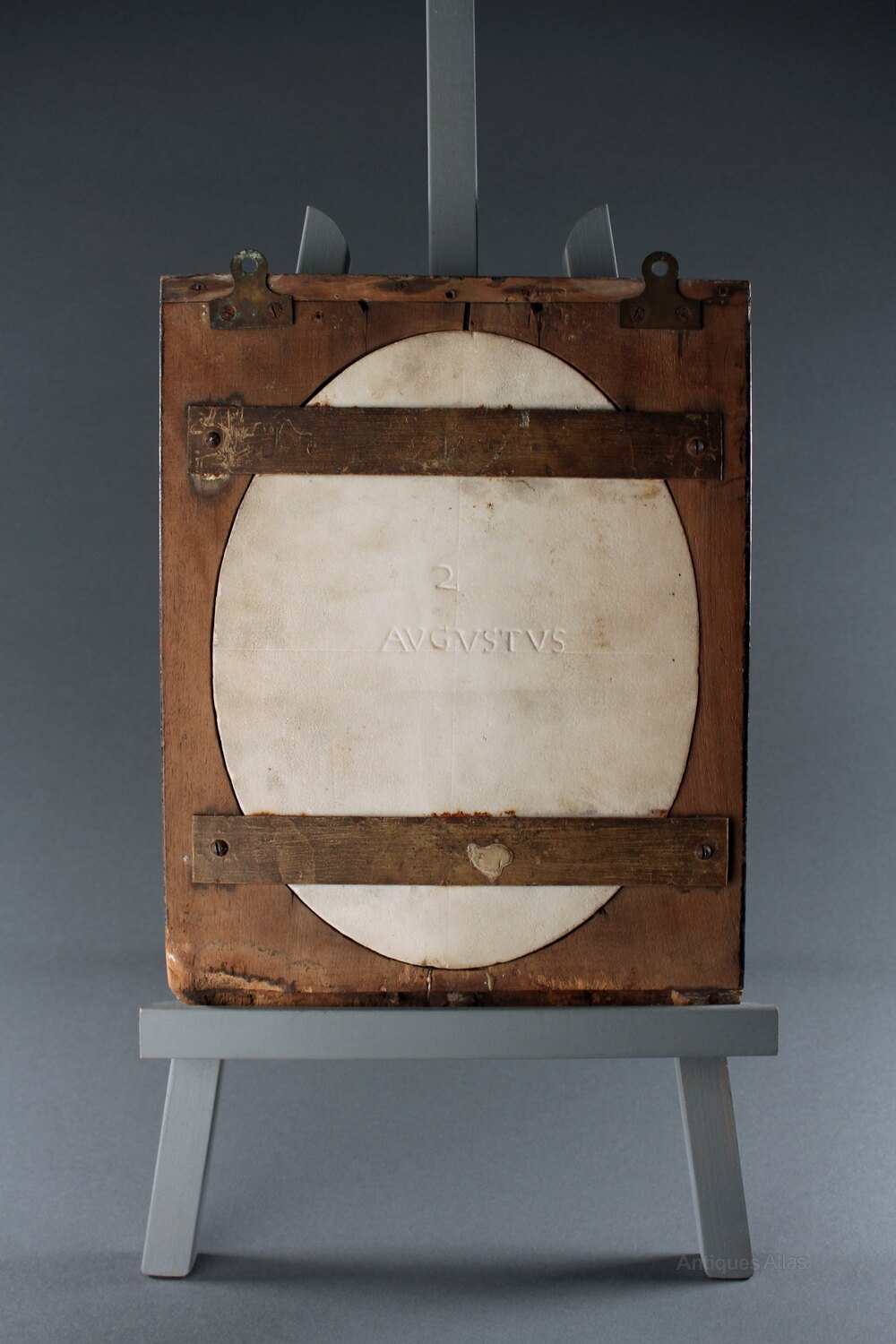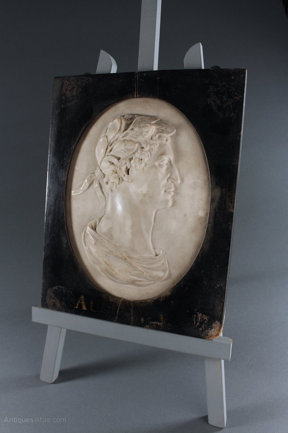 Very rare, superb quality, late 18th Century Grand Tour white statuary marble oval relief portrait plaque of Augustus Caesar. Mounted in its original ebonised wooden frame with faint gold painted remnants of the name 'AVGVTVS' to the base. Reverse of the marble also inscribed, 'AVGVTVS' with the number 2 indicating it was probably once part of a pair or a series. In the manner of Gregorio di Lorenzo (circa 1436-1504). Rome, circa 1780.Shipping information