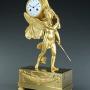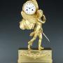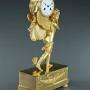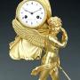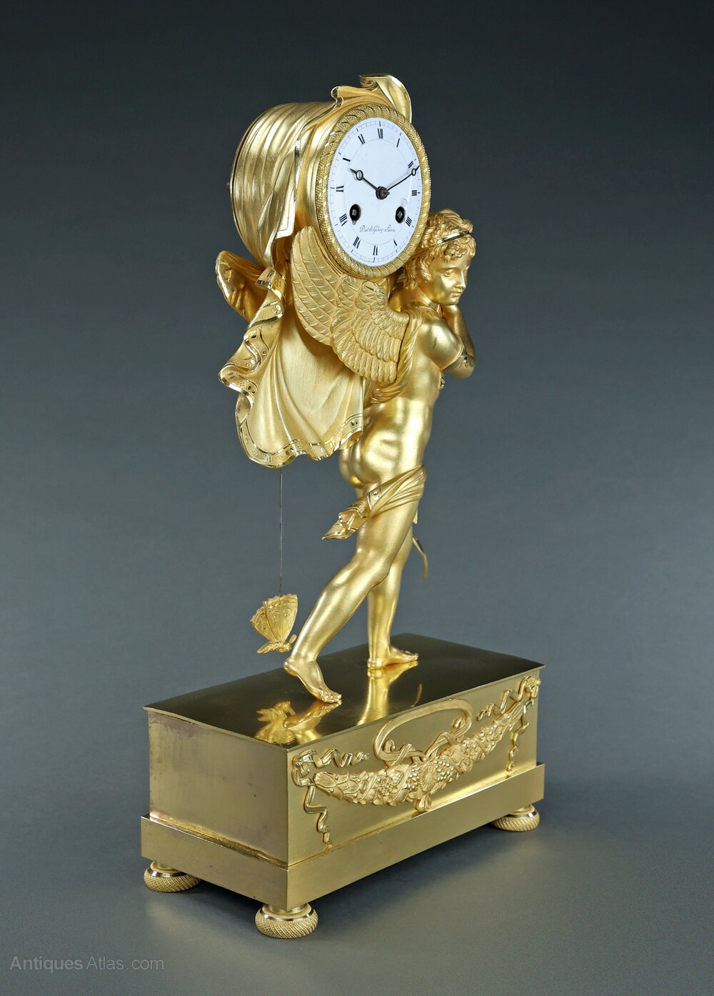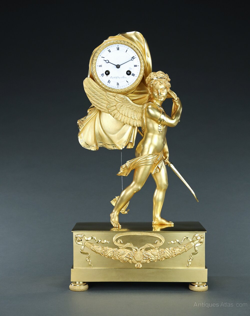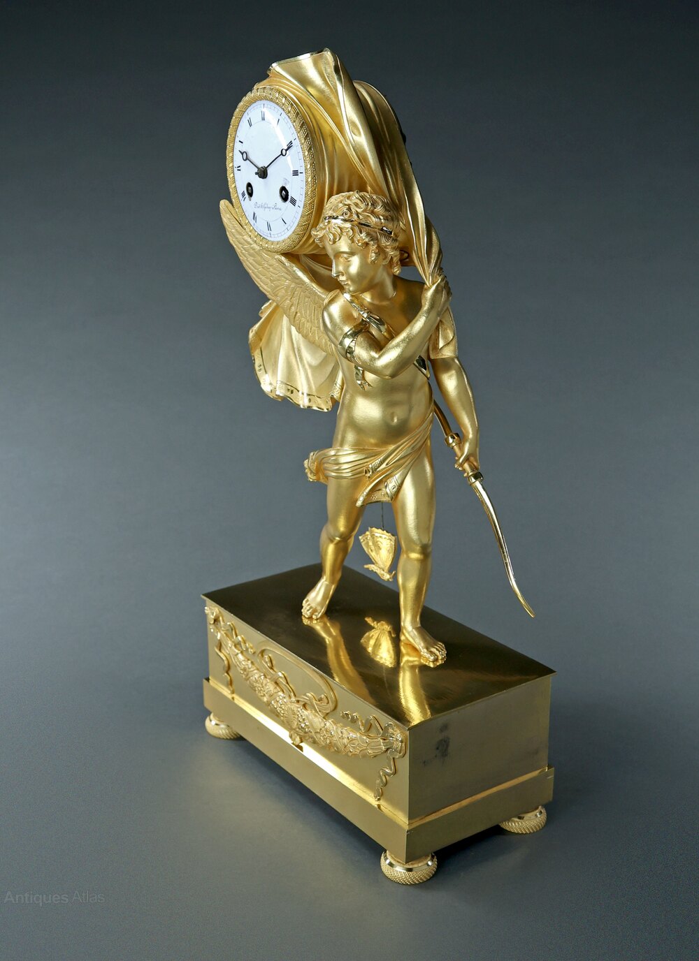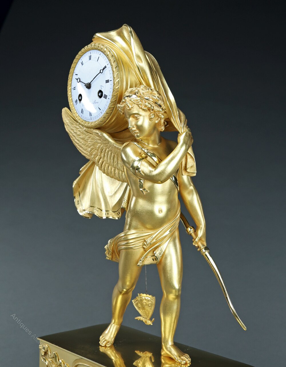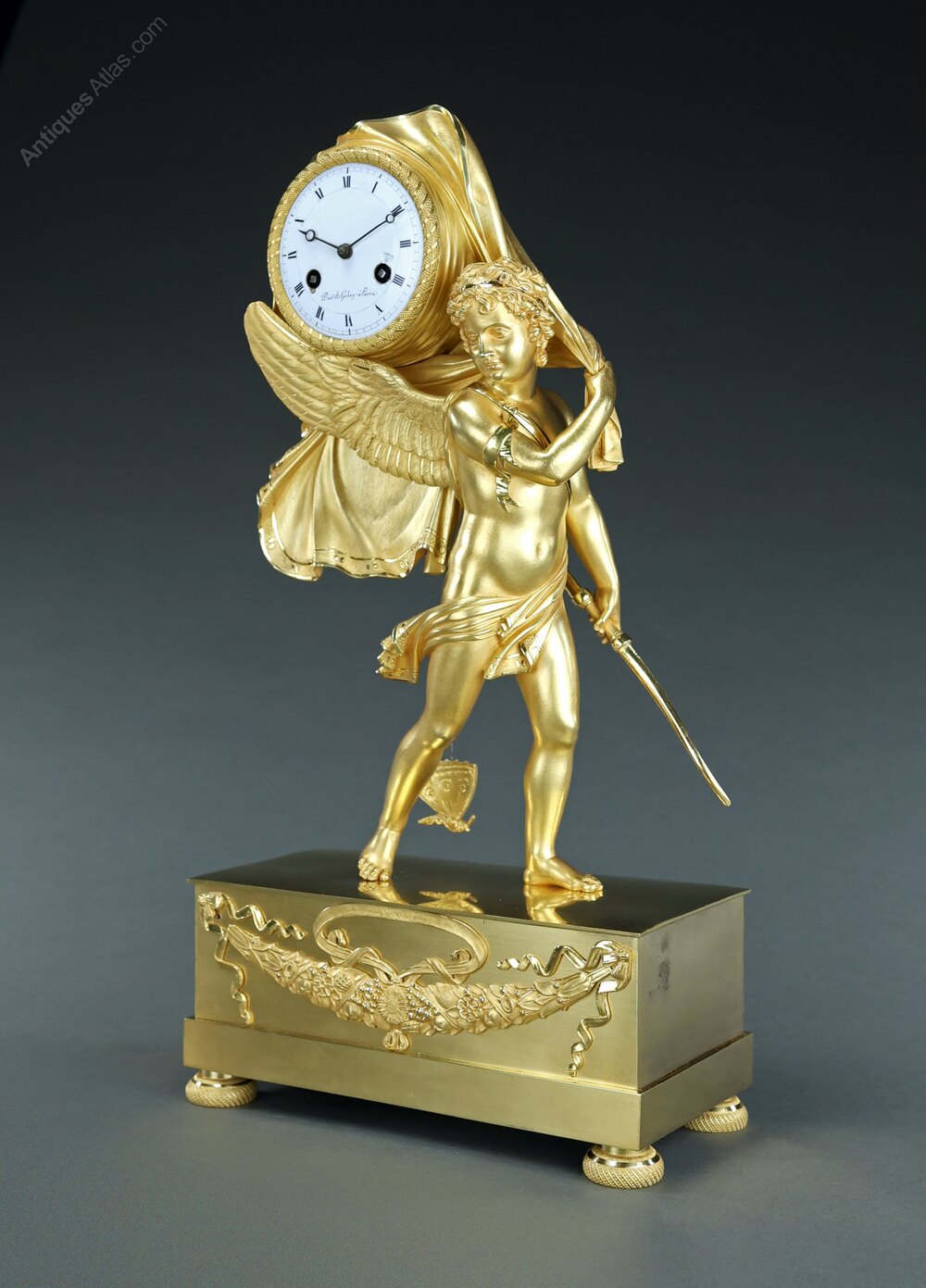 Fine French Empire period gilt bronze ormolu clock depicting an allegory of love and time signed Diot & Gobay à Paris. Often referred to as 'Cupid Carrying Time', or 'Amore Flees with Time' it is reputed to be after a design by Pierre-Philippe Thomire (1751–1843). Superbly sculpted dynamic pose of Cupid with fluttering robes housing the 8 day silk suspension movement on his wings accompanied by a butterfly that forms the pendulumn bob. White enamelled dial signed by Diot the horolger and Gobay the bronzier with beautiful Breguet style hands. The figure standing on a rectangular plinth, mounted at the front with a ribbon-tied floral and foliate swag, supported on bun feet. Beautiful example, well cast and chiselled with both matt and burnished gilt bronze finishes. France, circa 1815. For other examples see Elke Niehüser, 'French Bronze Clocks', page 230 and in the series of Tardy books 'La Pendule Française' part 2, page 431.H 42.5cm x W 22cm x D 11cm