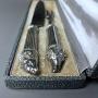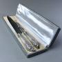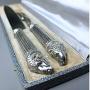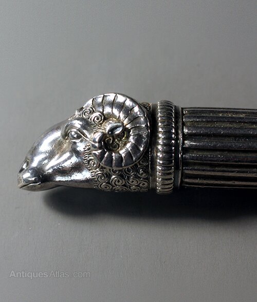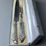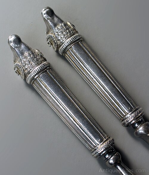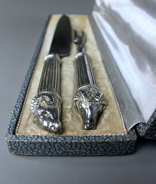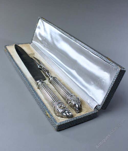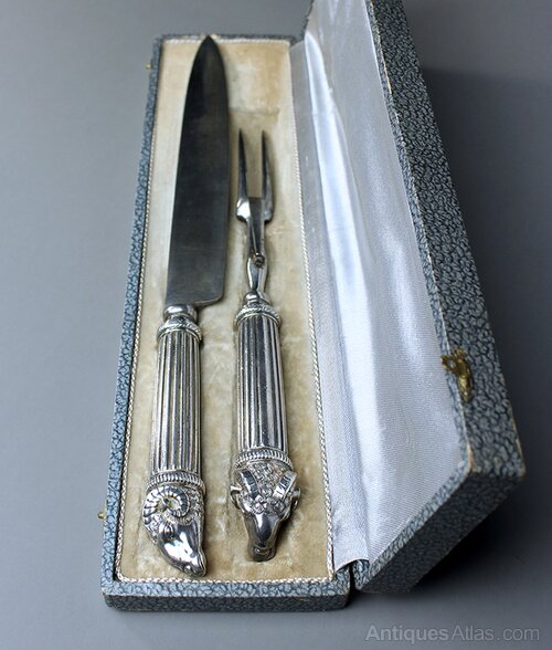 Very fine set of early 19th century Neoclassical carving cutlery in silver with superbly detailed rams head handles based on original Roman patera and very similar to terminals used on Empire period beds and tables. One small stamp to each handle which looks like a small object silver metal guarantee stamp for Paris 1798-1809. The blade is stamped 'Sparling' probably for the late 18th century English cutler Robert Sparling. His trade card from his premises in St James, Haymarket, London lists his skills thus 'Makes & Sells all sorts of Cutlers Ware, as Knives & Forks both for Table and Dezert with Hafts in Ivory, Wood or Horn, Silver and China, or any other curious handles. Mounted in the best Blades'. Well fitted associated box. Anglo French George III / Empire period, circa 1800.Box: H 4cm x W 36cm x D 9cm