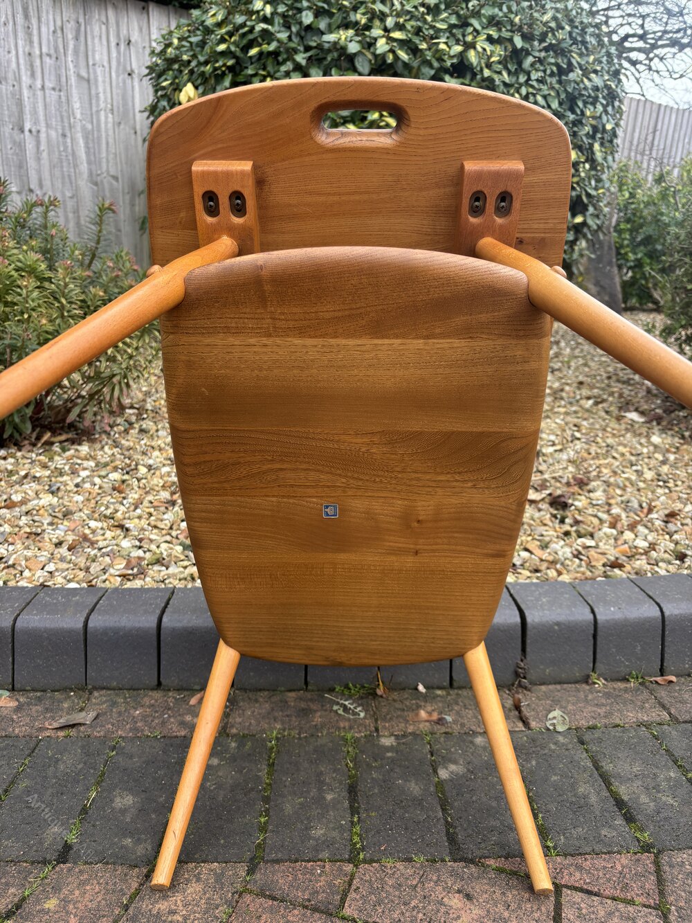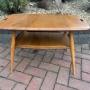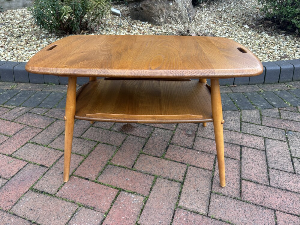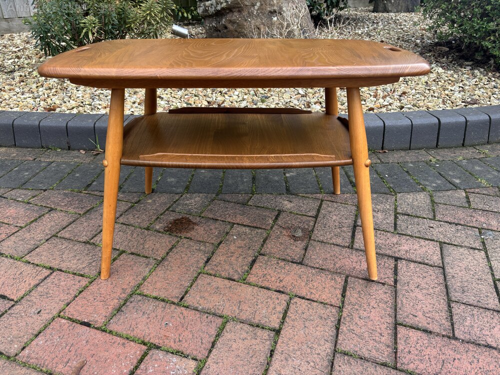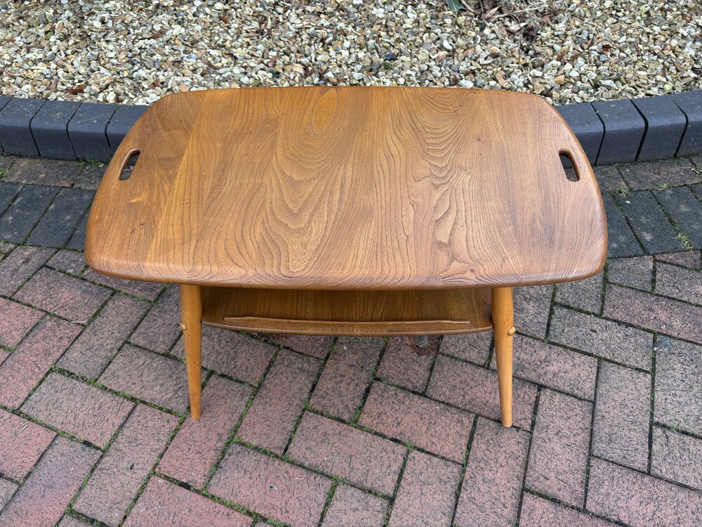 A mid century Ercol butler's tray table (model 457) having beech legs with an elm top and magazine under-shelf.The top has two incised handles for carrying, the under-shelf has a small lip to all sides.