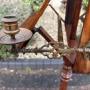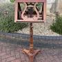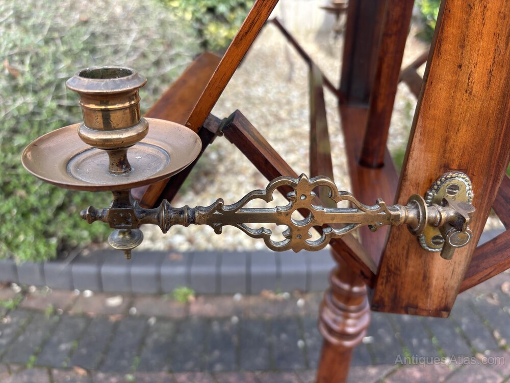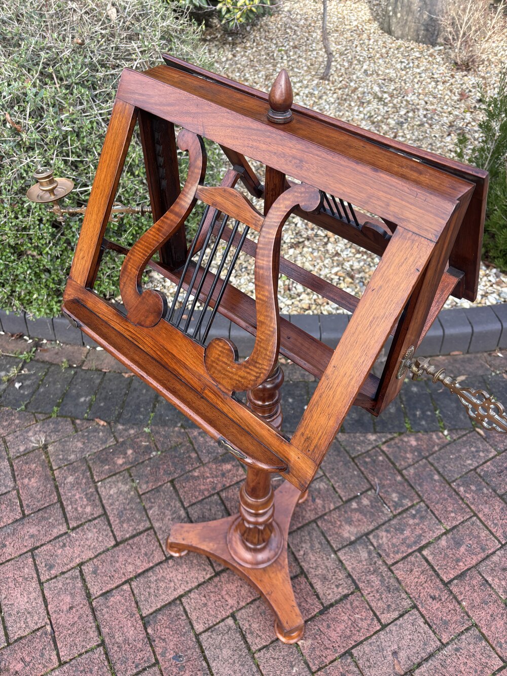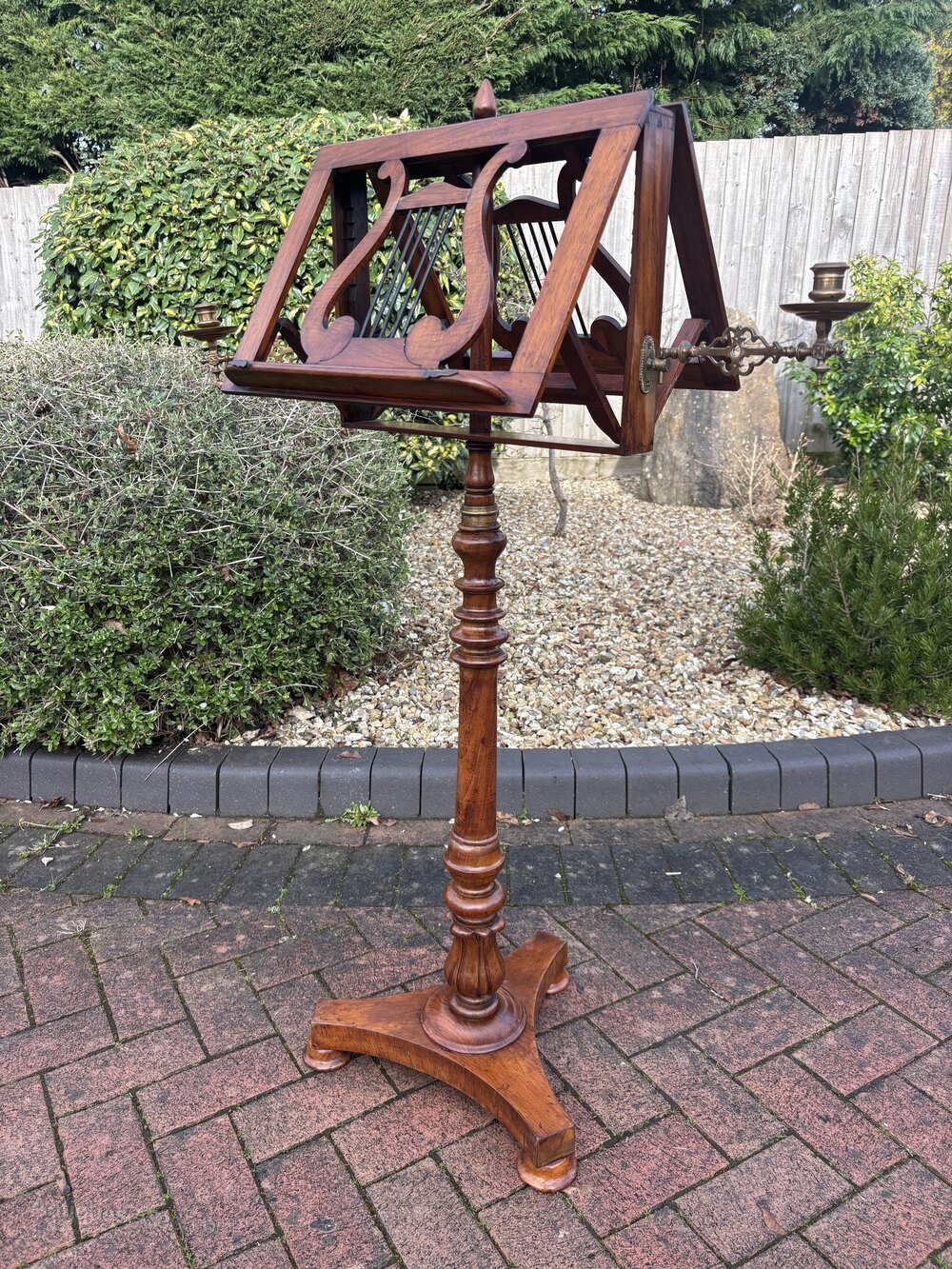 A very fine Victorian solid walnut duet music stand, surmounted by a turned finial, lyre shaped sheet music rests which are adjustable on both sides, flanked by its original brass candle holders. Supported on a turned central height adjustable column, tri-form base and bun feet.In wonderful original condition.