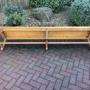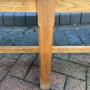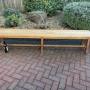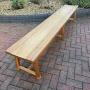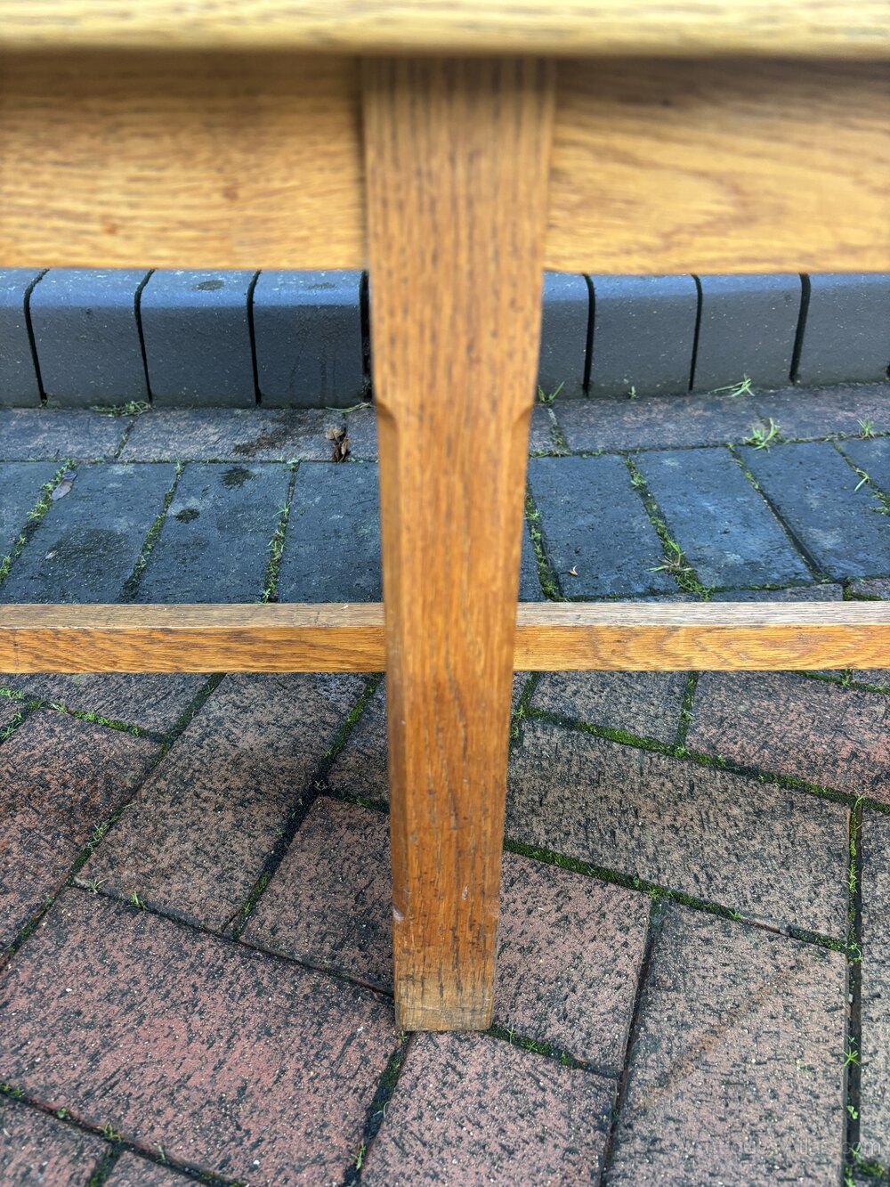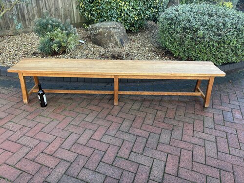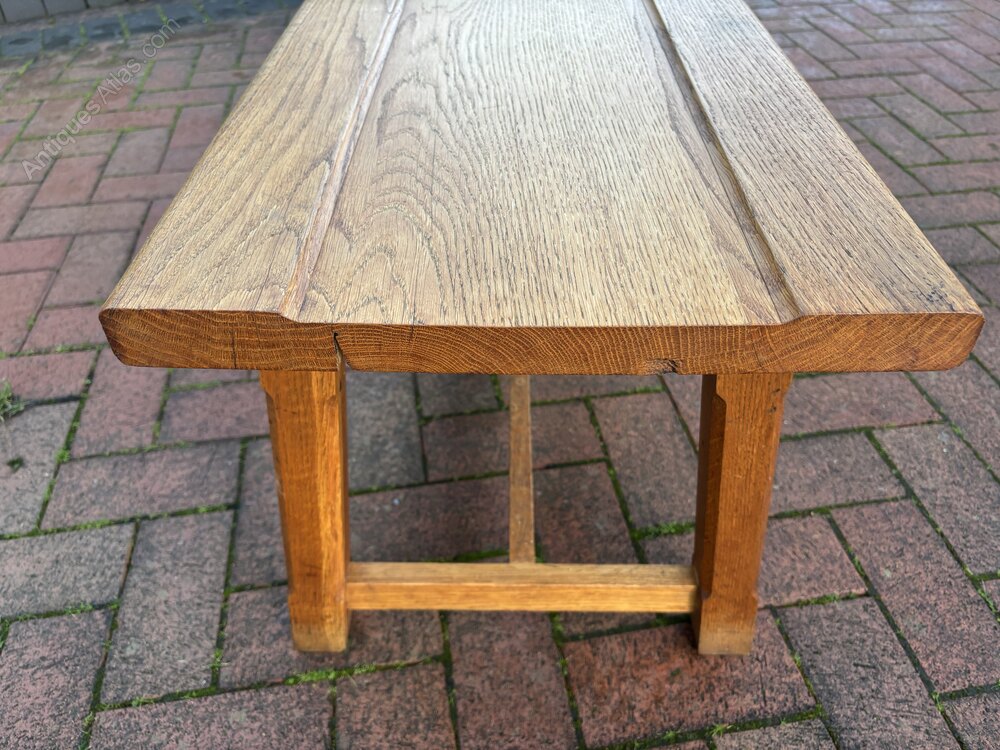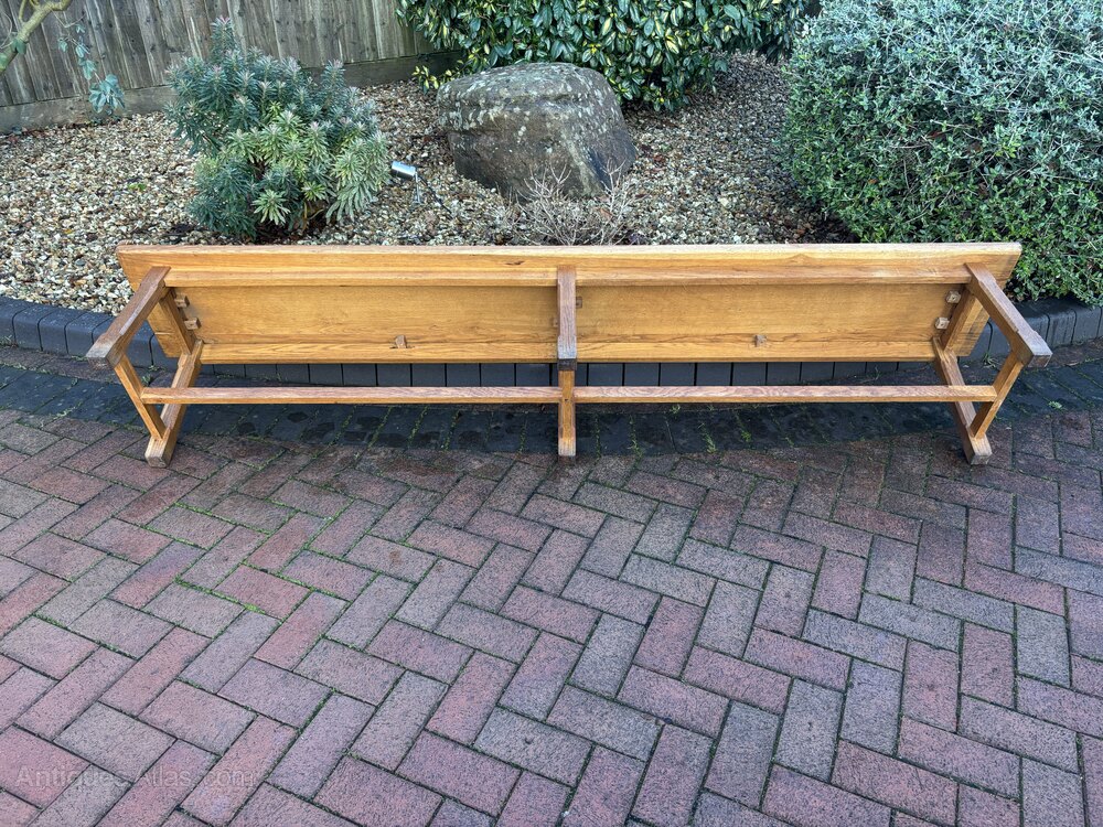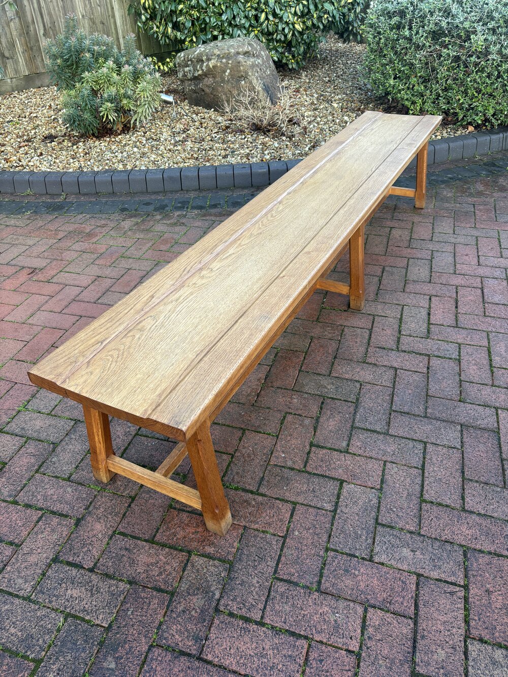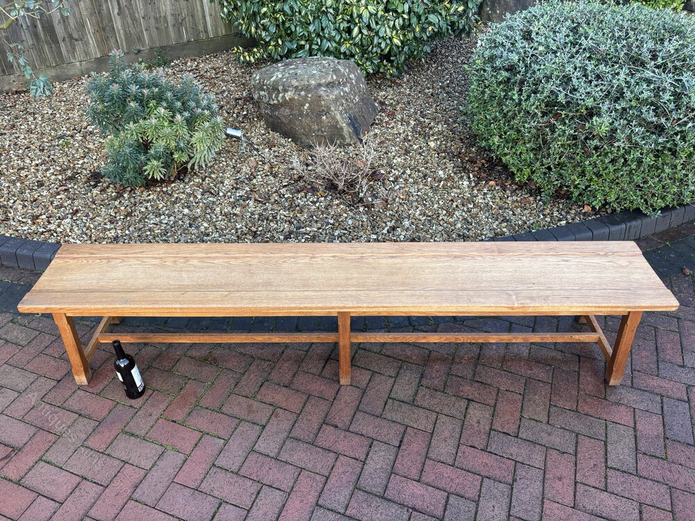 Early 20th century Cotswold School solid oak long hall bench, having splayed chamfered legs connected by a stretcher.The seat is nicely shaped as opposed to a plain plank.
