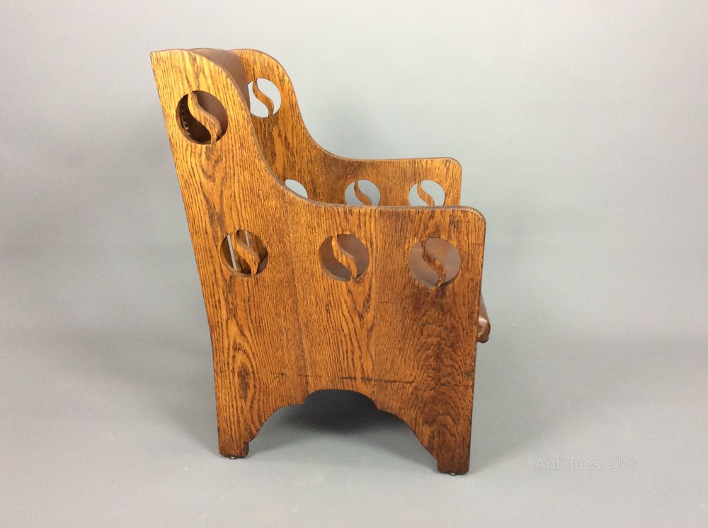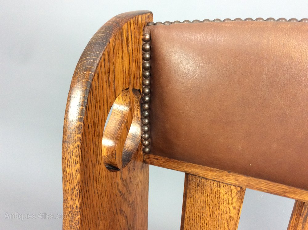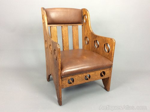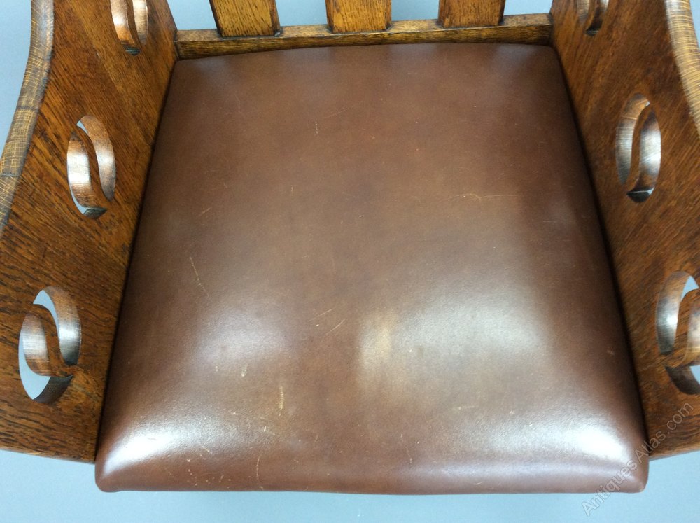 Arts & Crafts oak lounge chair by Goodyers of Regent St, London c1900, having yin-yang cut out motifs to the sides and aprons, leather backrest and leather drop in leather seat.In good condition but there are a couple of light scuffs on the leather commensurate with age. 86cmH x 59cmW x 60cmD