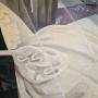 'The Bride and the Mourners' shows a beautiful bride in profile, in a stunning cream 'méringue style' wedding dress with an ultra sheer veil and fabulous cream platform shoes diving from a church into a waiting 1980s Mini Classic. A handsome man - possibly the groom in formal morning dress, grey tie and black top hat is standing behind the open Mini door. Meanwhile a funeral cortege is taking place, entering the church, behind her. Mourners in black top hats and formal morning dress, with black ties are moving a coffin and wreath into the church. Does this dramatic and mysterious vignette suggest the bride escaping from a noir style thriller!?? What do you think is happening??