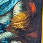 The palette is regal yet restrained: deep cerulean blues, muted golden ochres, and rich crimson shadows frame her luminous skin. Brushwork is both fluid and expressive—the artist achieves drapery movement through confident, sweeping strokes, while the sitter’s face is modeled with soft, subtle blending, achieving lifelike delicacy. Textural contrasts between fabrics, fur, and feather add depth and sophistication. Inspired by the Grand Manner portrait tradition, the artist emphasizes atmosphere and presence over strict realism.