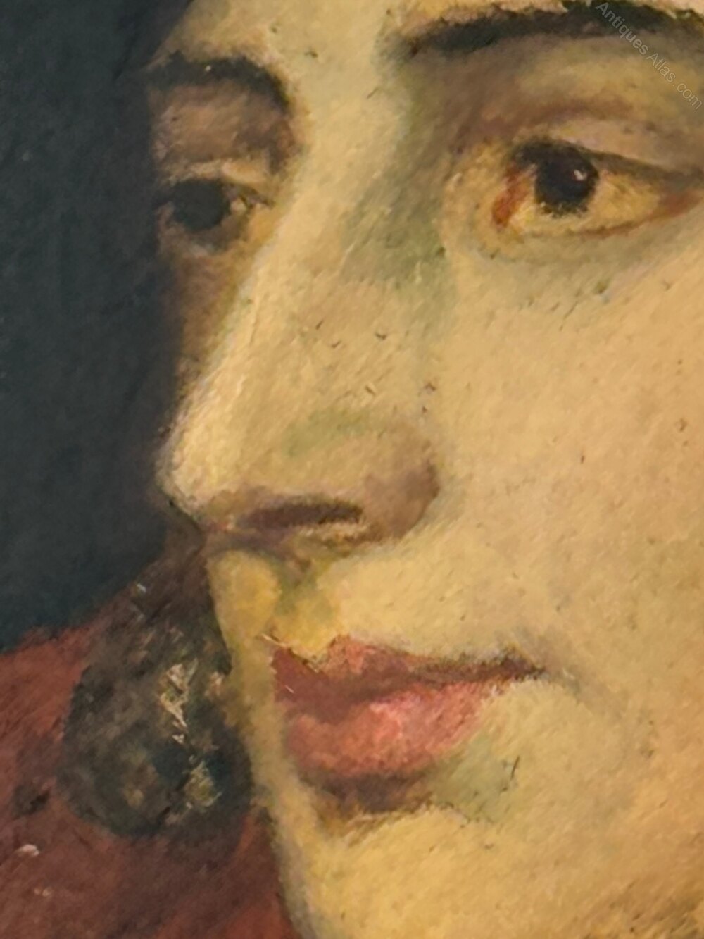 The work remains structurally sound with visible craquelure and foxing staining, appropriate for its age. Having paint touch-ups are visible along the outer edges of the background but have been executed with care, preserving the sitter’s features and integrity. Surface texture remains vibrant and cohesive.