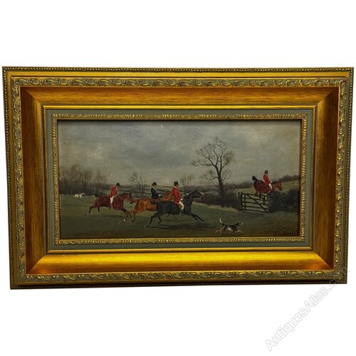 At the right, a huntsman and mount take a wooden gate in mid-leap—a classic motif of Victorian hunting art—captured with taut energy.