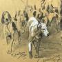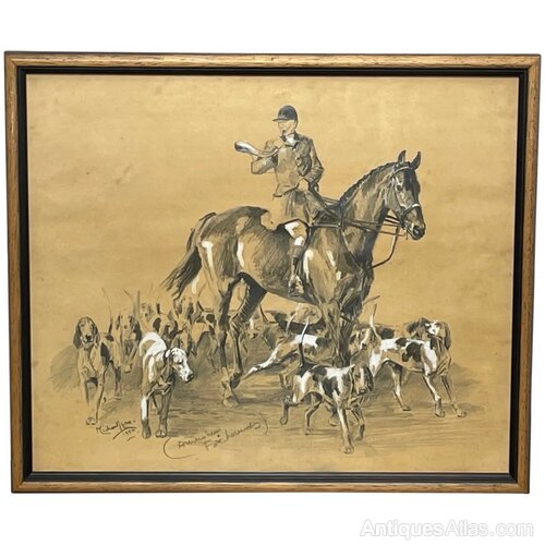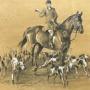 The scene shows the master of the hunt on horseback, bugle raised, as a lively pack of American Foxhounds works a scent trail. Lyne captures the energy and purpose of the moment with confident draughtsmanship and an excellent understanding of equine and canine form. Executed in pencil and heightened with white chalk, the drawing has strong contrast and depth, with chalk highlights lifting key details in the horse, rider and hounds.
