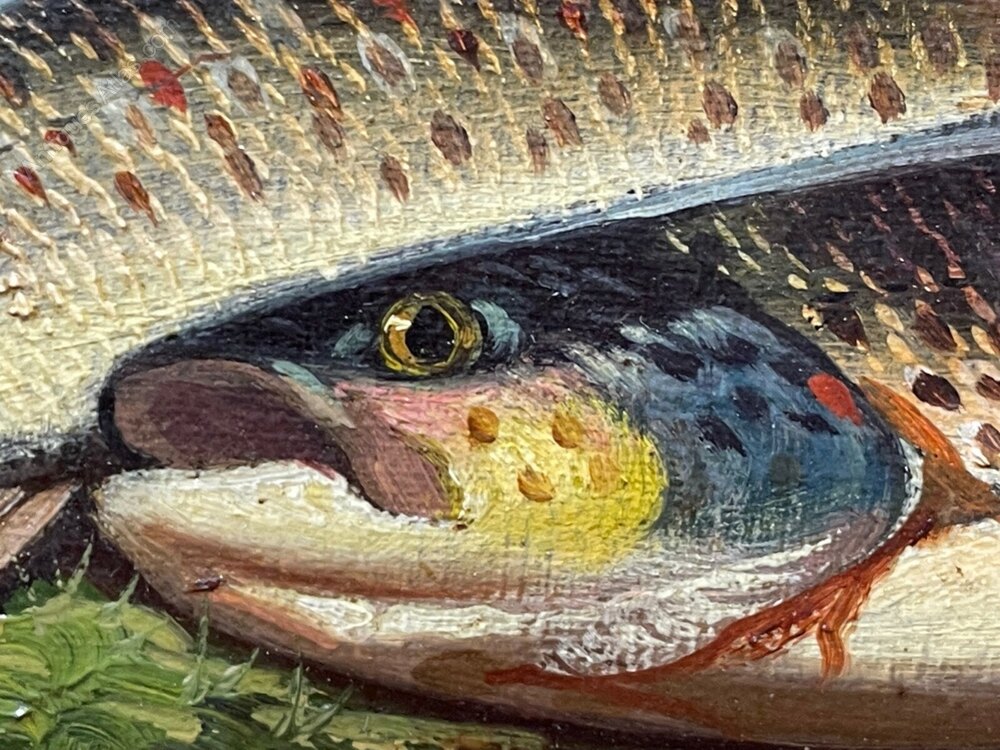 James B. Russell (1867–1956) was born in Edinburgh and worked within a family tradition of specialist fish painting. His father, John Bucknell Russell, was an established carver and painter of salmon producing accurate life-size fish works for sporting patrons. James continued this tradition into the early 20th century, combining realistic fish depiction with more atmospheric landscape handling.