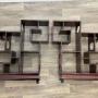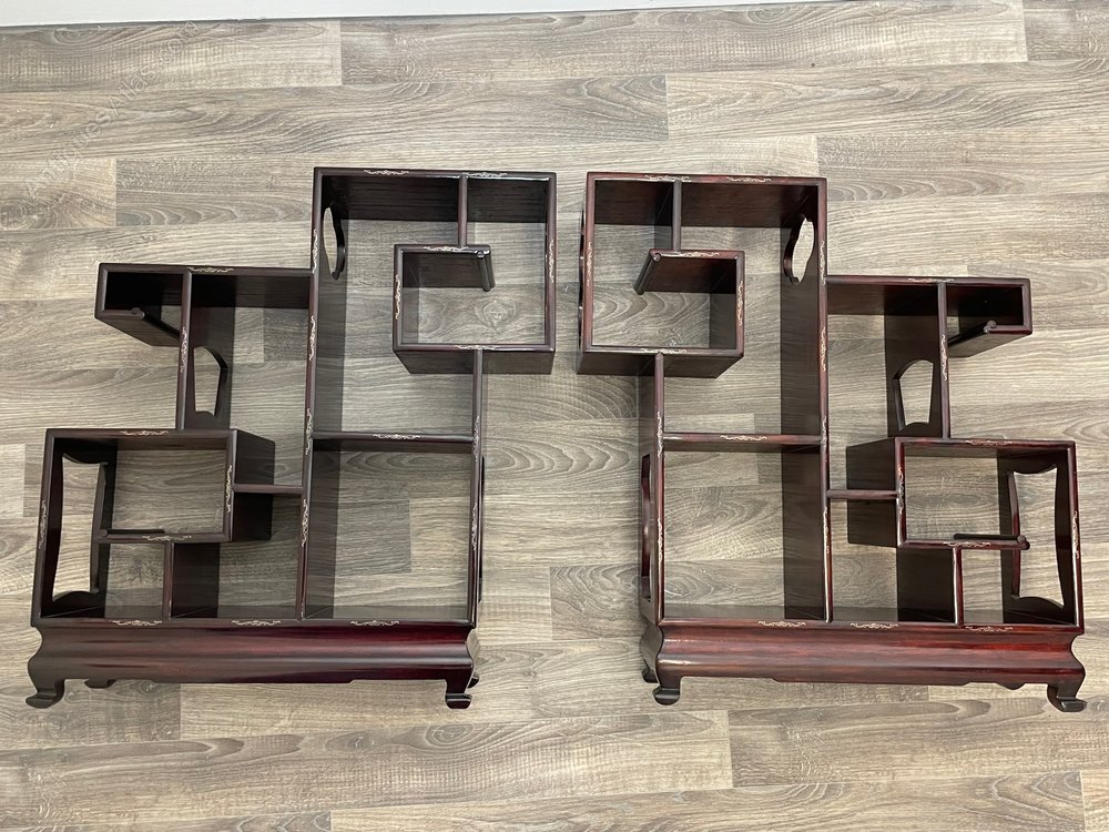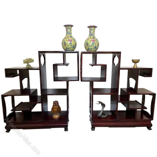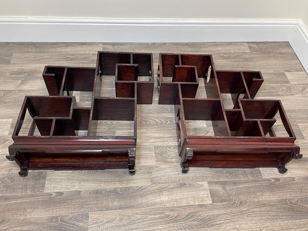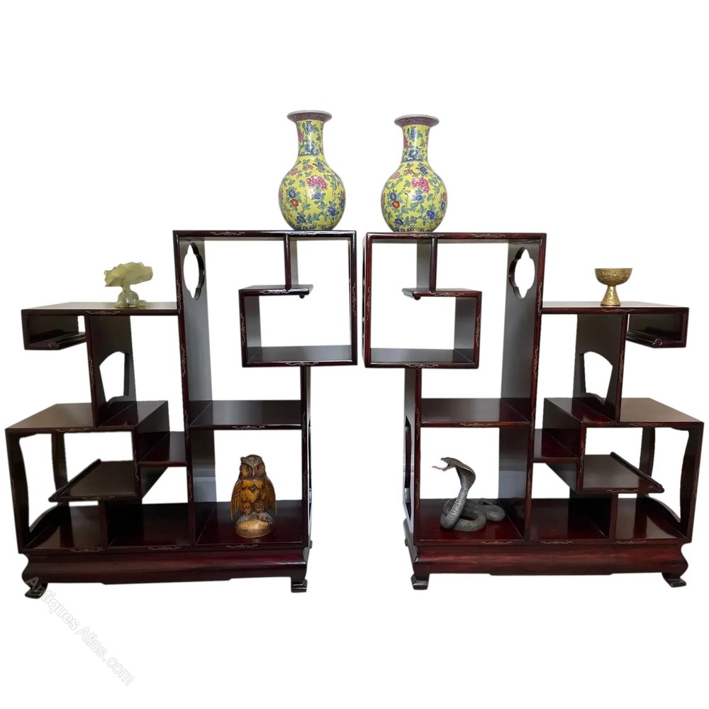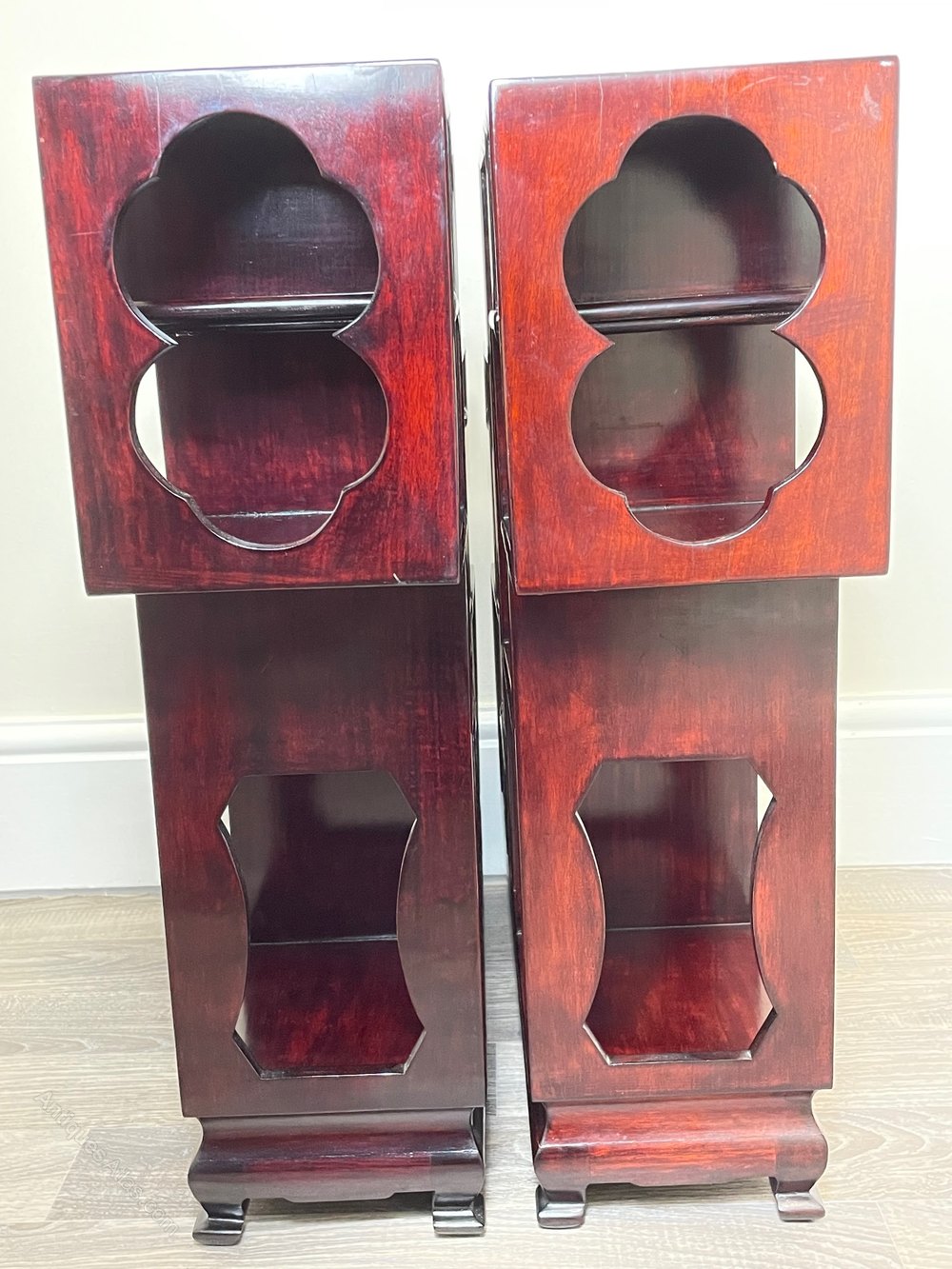 Pair Rare Small Hardwood Chinese Tiered Etagere Open Shelving Curio Stands.A feature that stands out are the different shapes of the multiple fixed shelves on each.