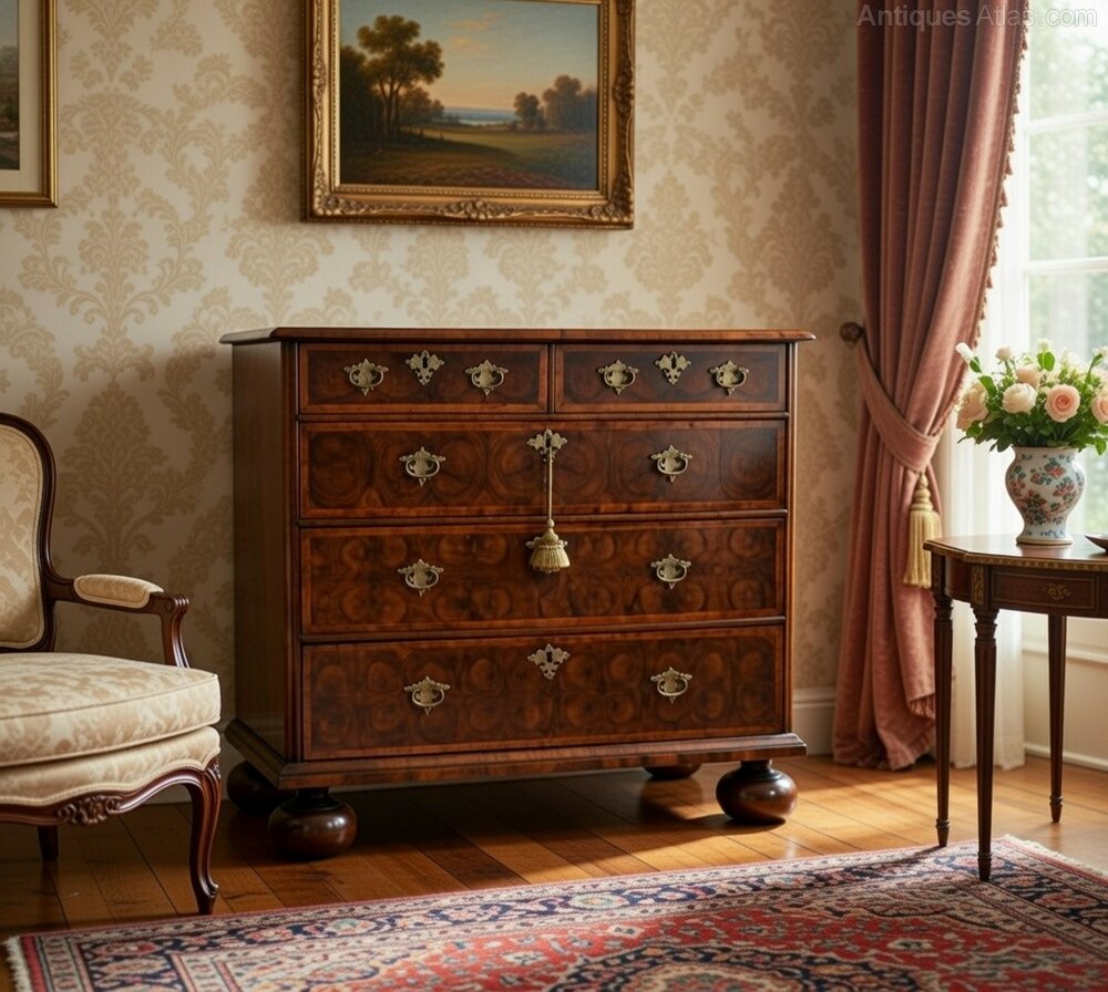 We are offering for your home this most Stunning Oyster Veneered and Walnut Chest of Drawers. Two over Three Drawers that are Banded. Geometric Patterned Top and Banded. Walnut Veneered sides with banding decoration. Cross grained mouldings throughout Sat on Later Bun feet very much of the Late 17th Century Period. Later Quality Brass Handles and a working key. Dimensions are 37.5 inches wides 22.25 inches deep and 33.5 inches tall. Beautiful Colour and Patination Throughout this great great example.More images available upon request. Delivery within the Uk is in included in the asking price. Shipping is also a pleasure so please do inquire for a quote. Thanks for looking Chris 07778655965DateLate 17th Century