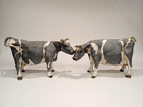 Wonderful sculptures of pair of cows. Measurements are: Height 32.5cm to 37cm Length 50cmElaine Peto graduated from Exeter College of Art & Design in 1985, where she studied animals via livestock markets and the abattoir, using the media of photography and drawing to record the structure of the carcass.