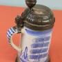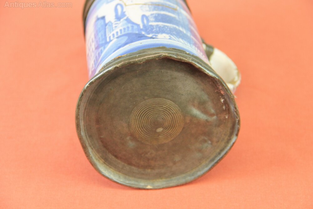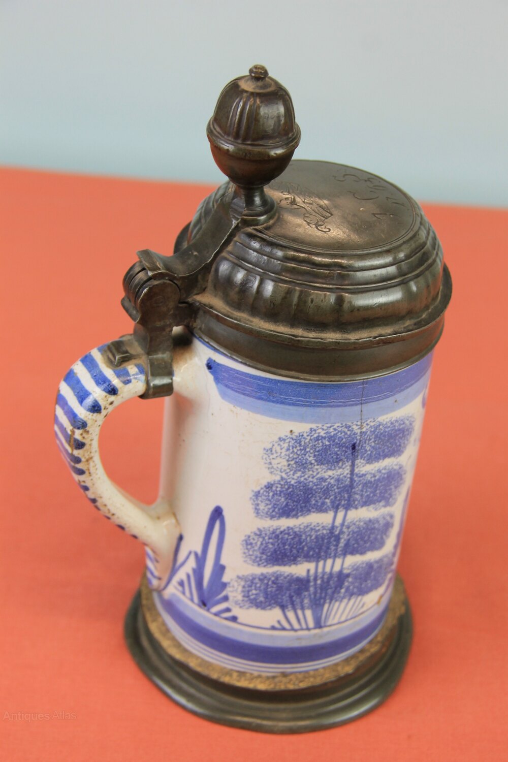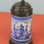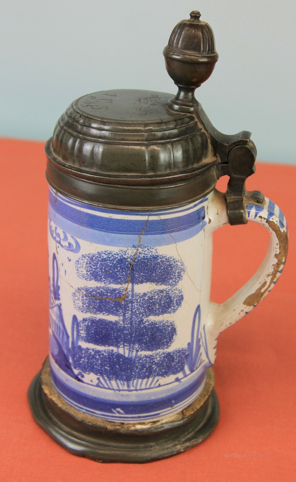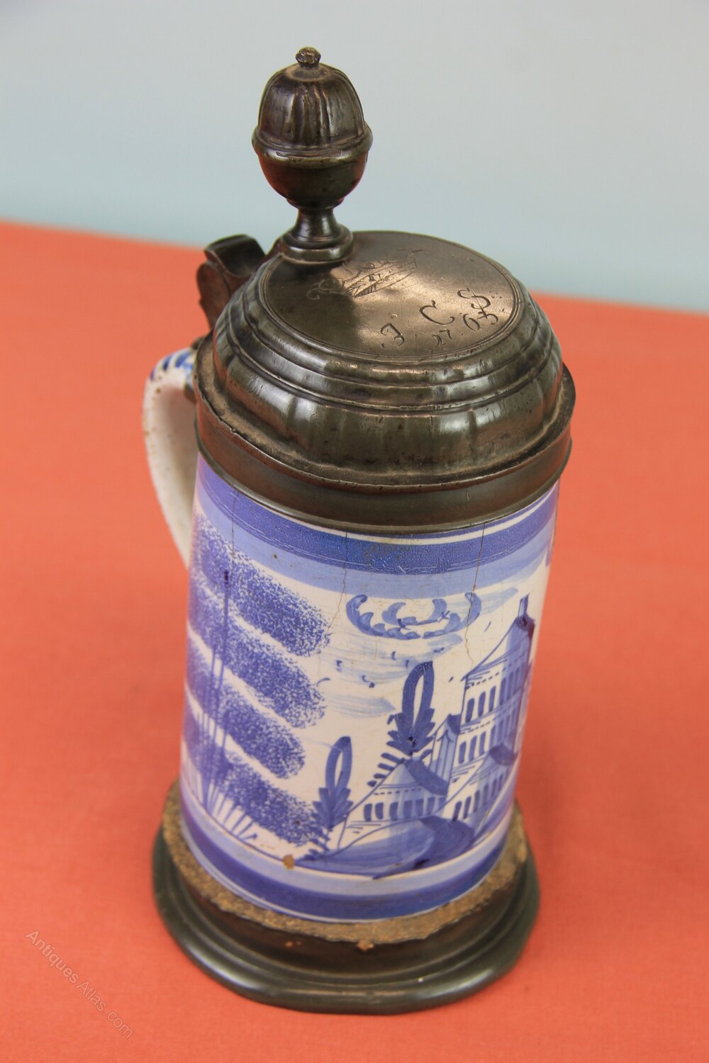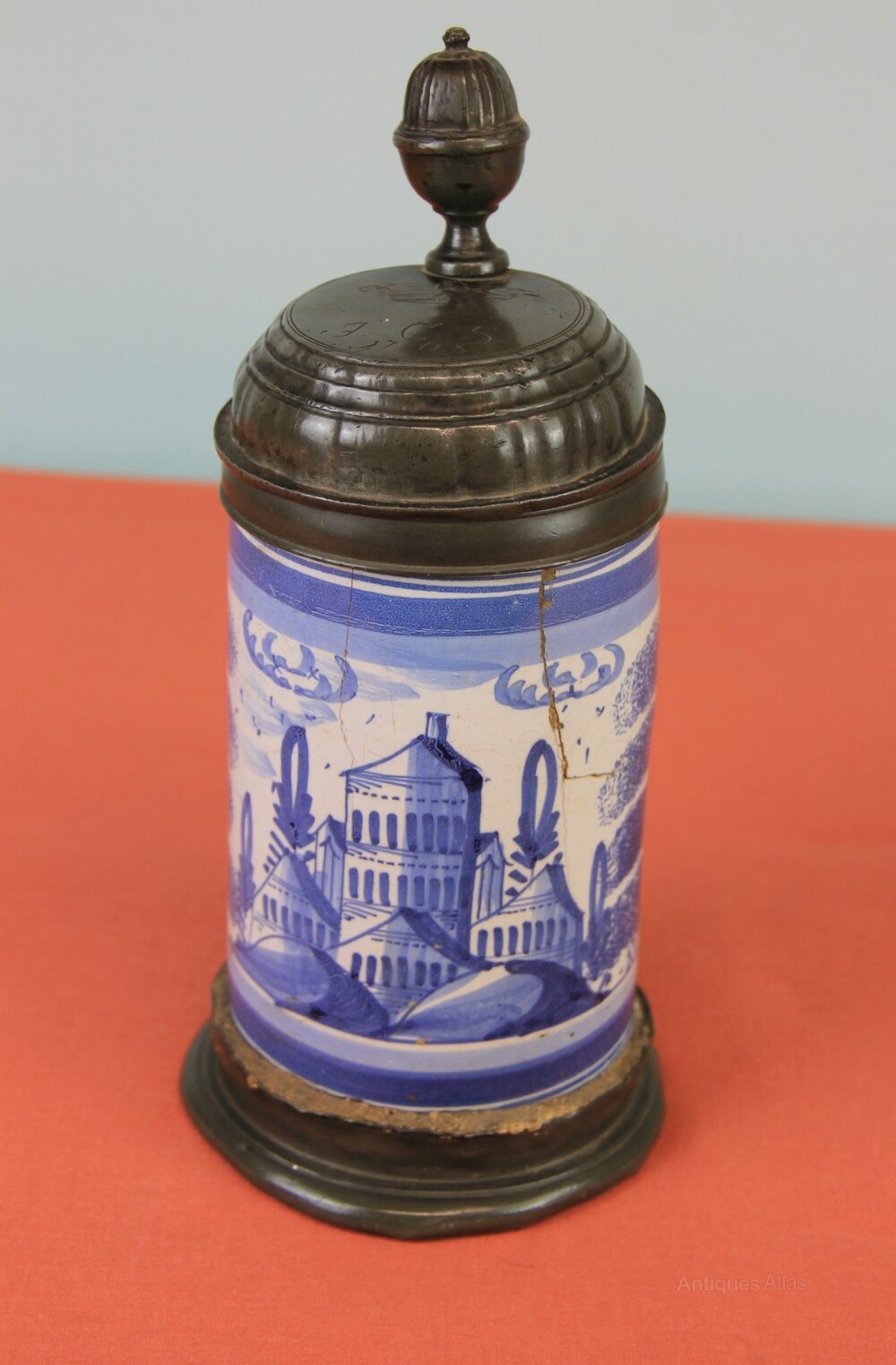 Mid 18th century Delftware German lidded tankard. Has a pewter lid and base. Lid has owners initials of 'JCS' with a coronet over it and dated 1763. Delftware body and handle with town scene and two sponge wear trees to either side all painted in blue.In generally used condition and cracks to the body.