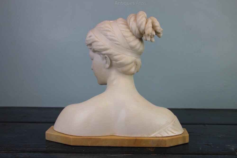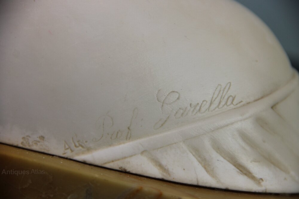 19th century alabaster bust of Poesie standing on a sienna yellow marble base. Head and shoulders with elaborate hair style. Signed on shoulder by Professor Antonio Garella. Old repair to neck and some small areas of imperfections.Approximately 36cm long, 17cm deep and 32cm high.