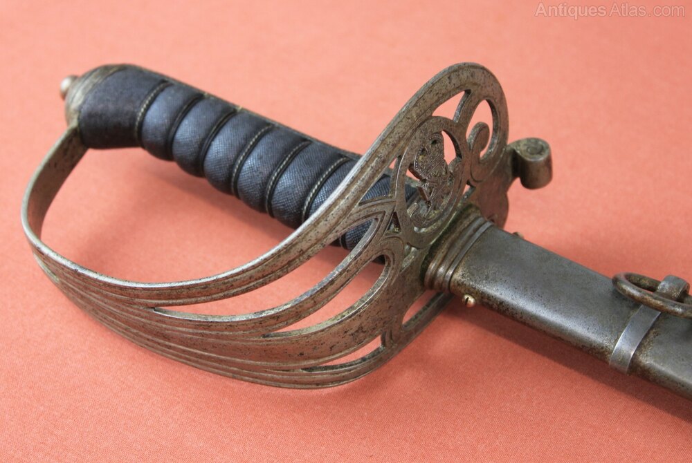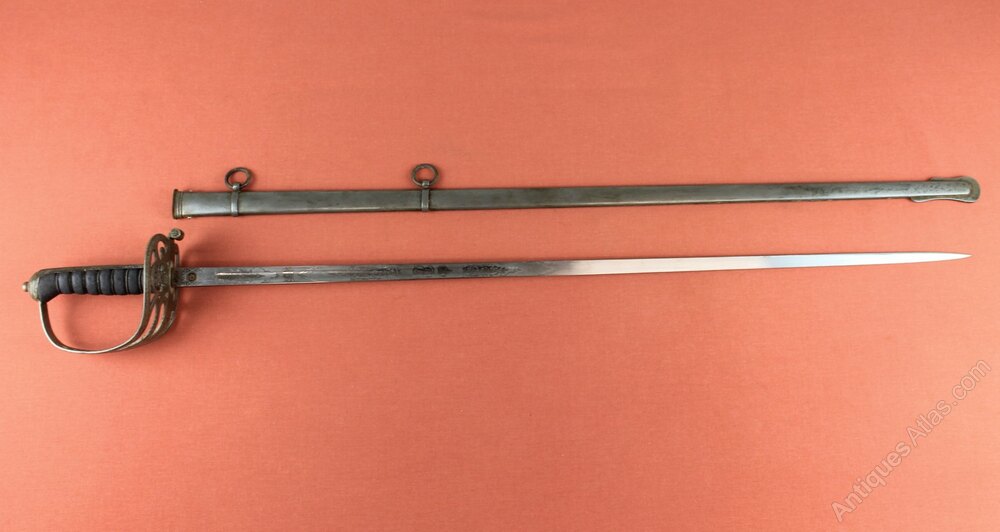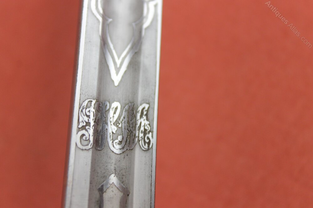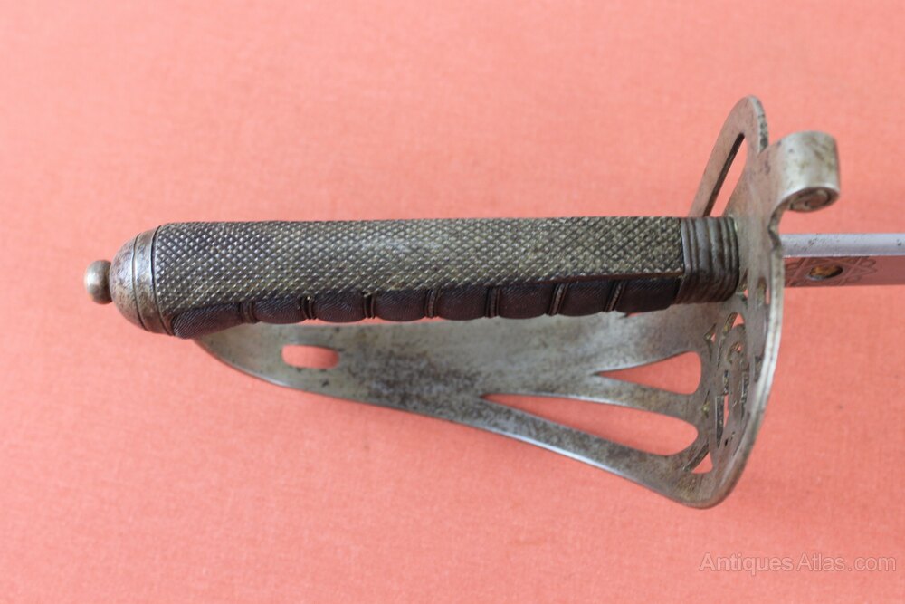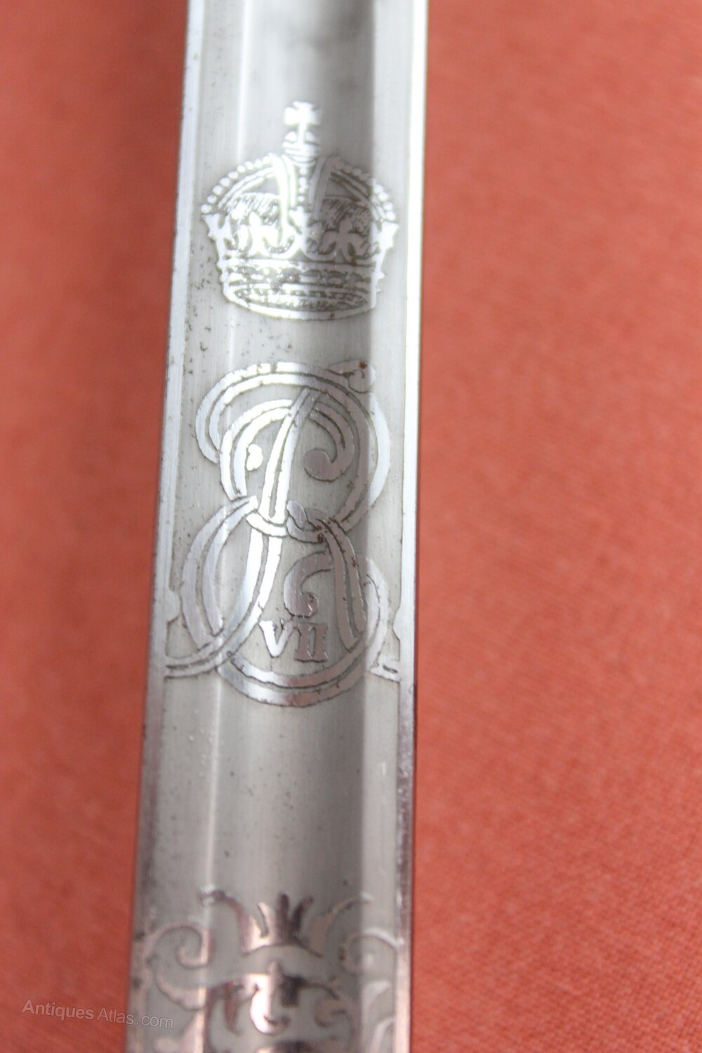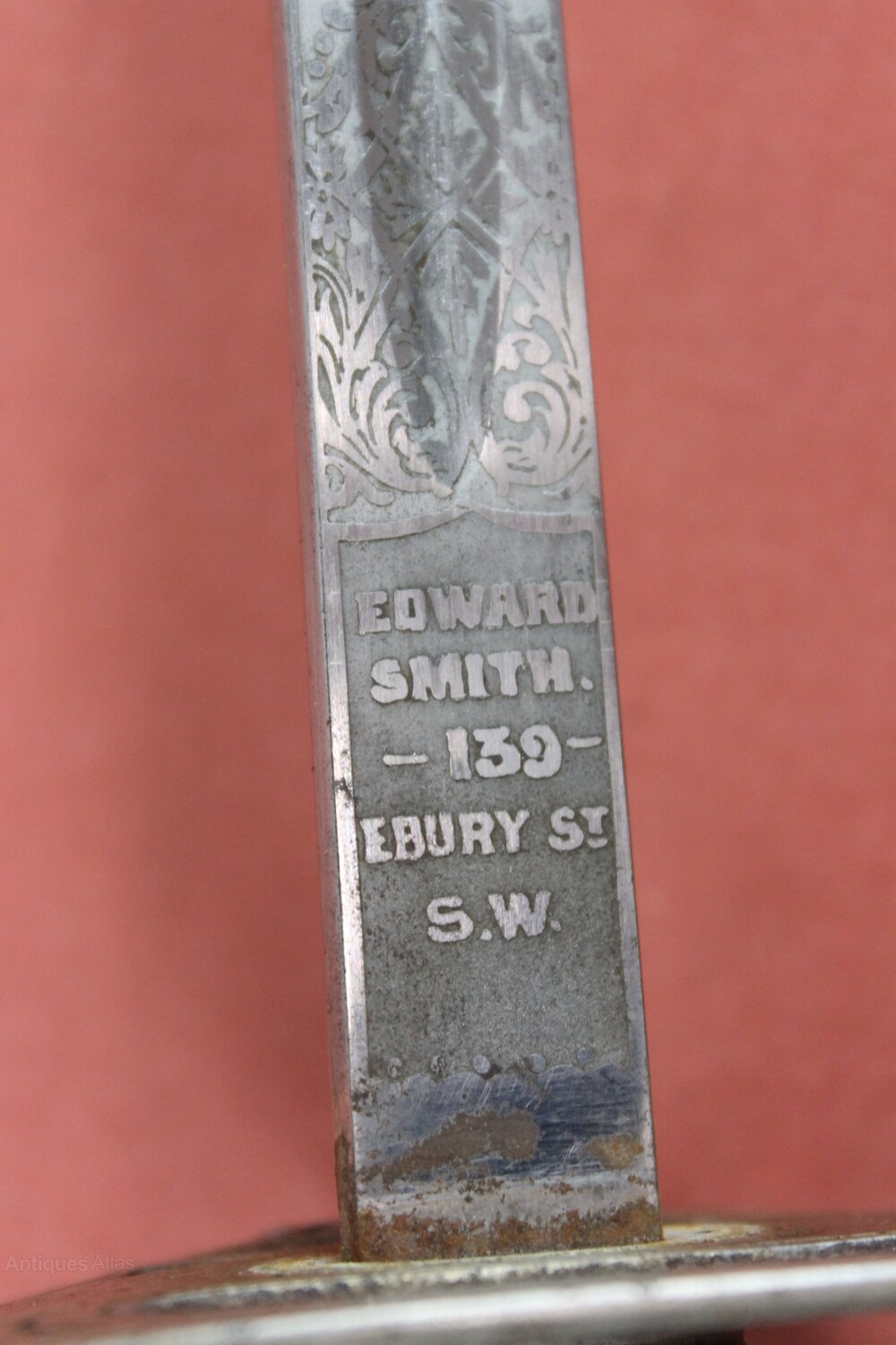 Edward VII Rifle Officers sword in its steel scabbard and marked as by Edward Smith, 139 Ebury St, SW (London). Silver wire bound shagreen grip and pierced gothic hilt with Rifle Bugle crest. Slim, single edged blade with original owners' initials etched in script. Acid etched blade with Edward VII crown and cipher and Rifles cipher to reverse side. Blade has most of its original polish. In good condition overall but some wear to the exterior plating of sword.Approximately 100cm overall and blade 82cm.