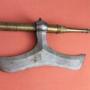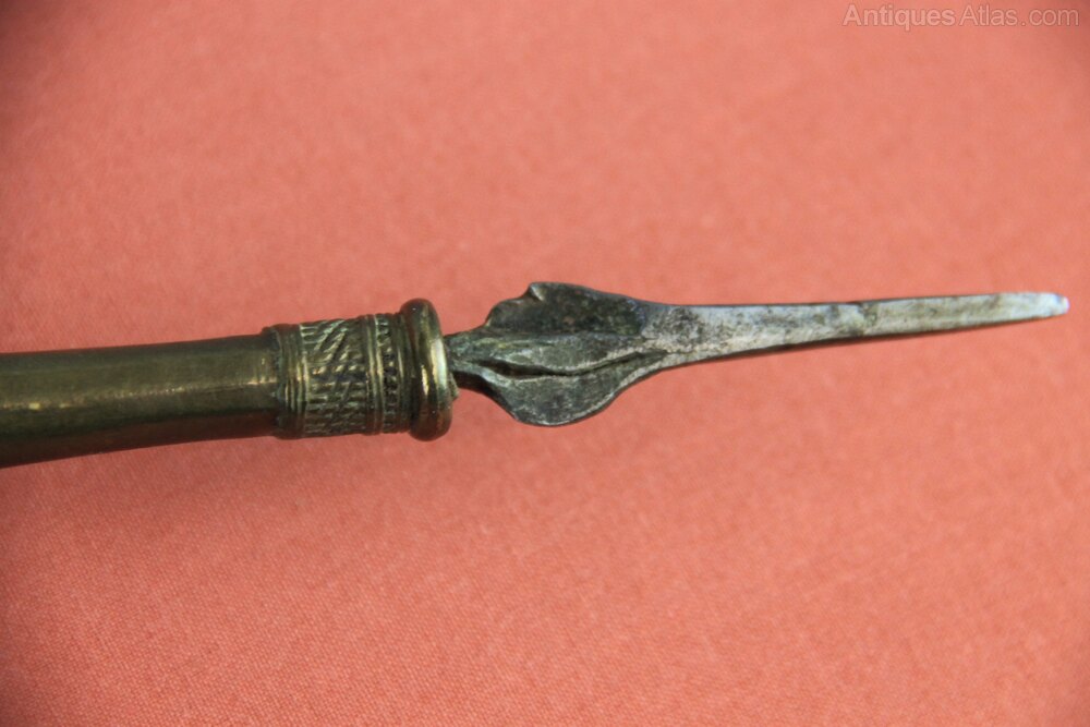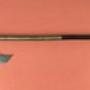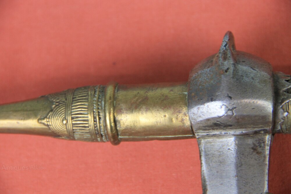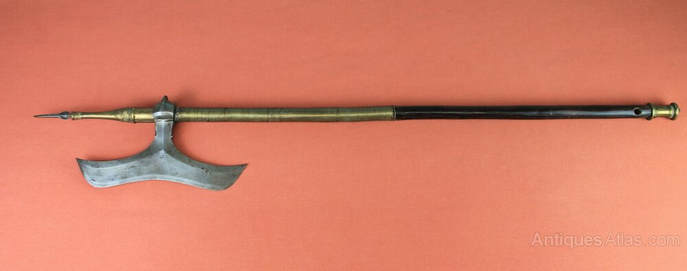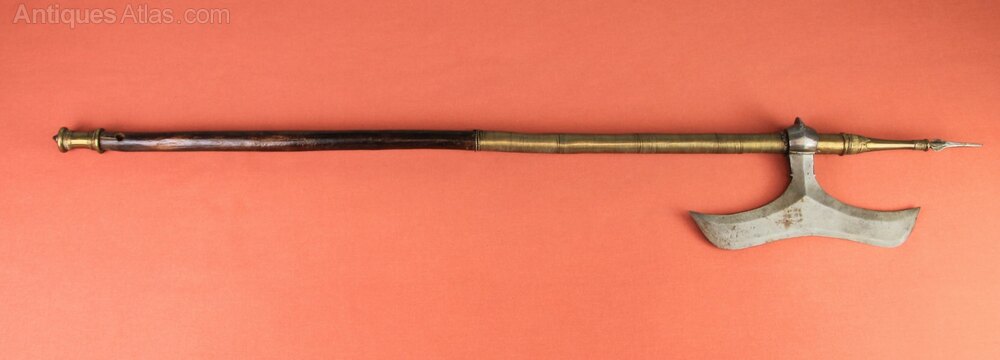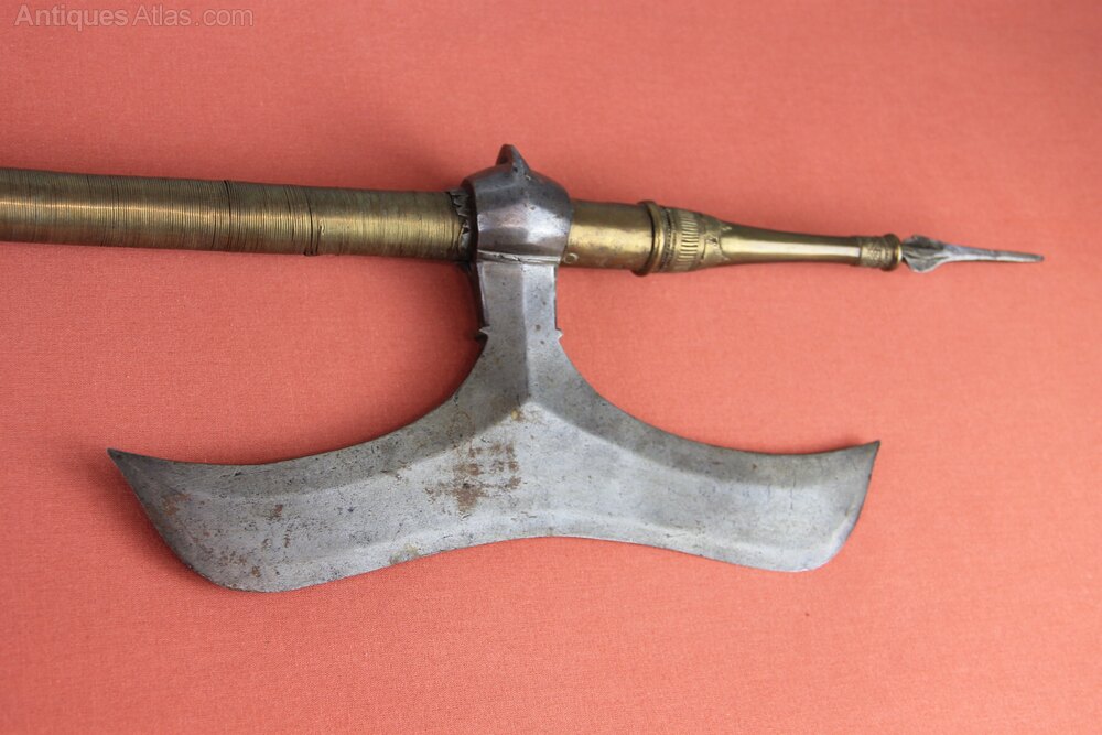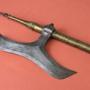 19th century large Indian Bulova axe with a moustached shaped iron blade and a brass wire bound wooden haft. There is a decorated brass mount with a spike. Wooden haft has a decorative brass end terminal. In good condition generally overall.Approximately 102.5cm overall and blade 26cm.