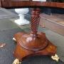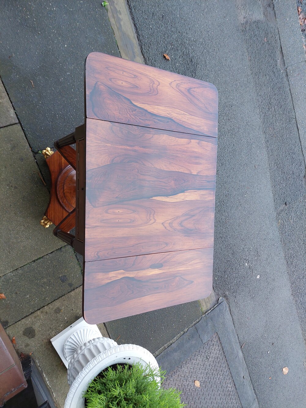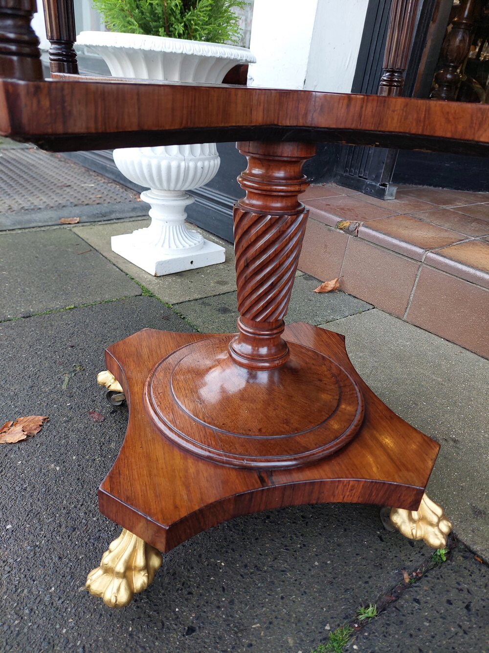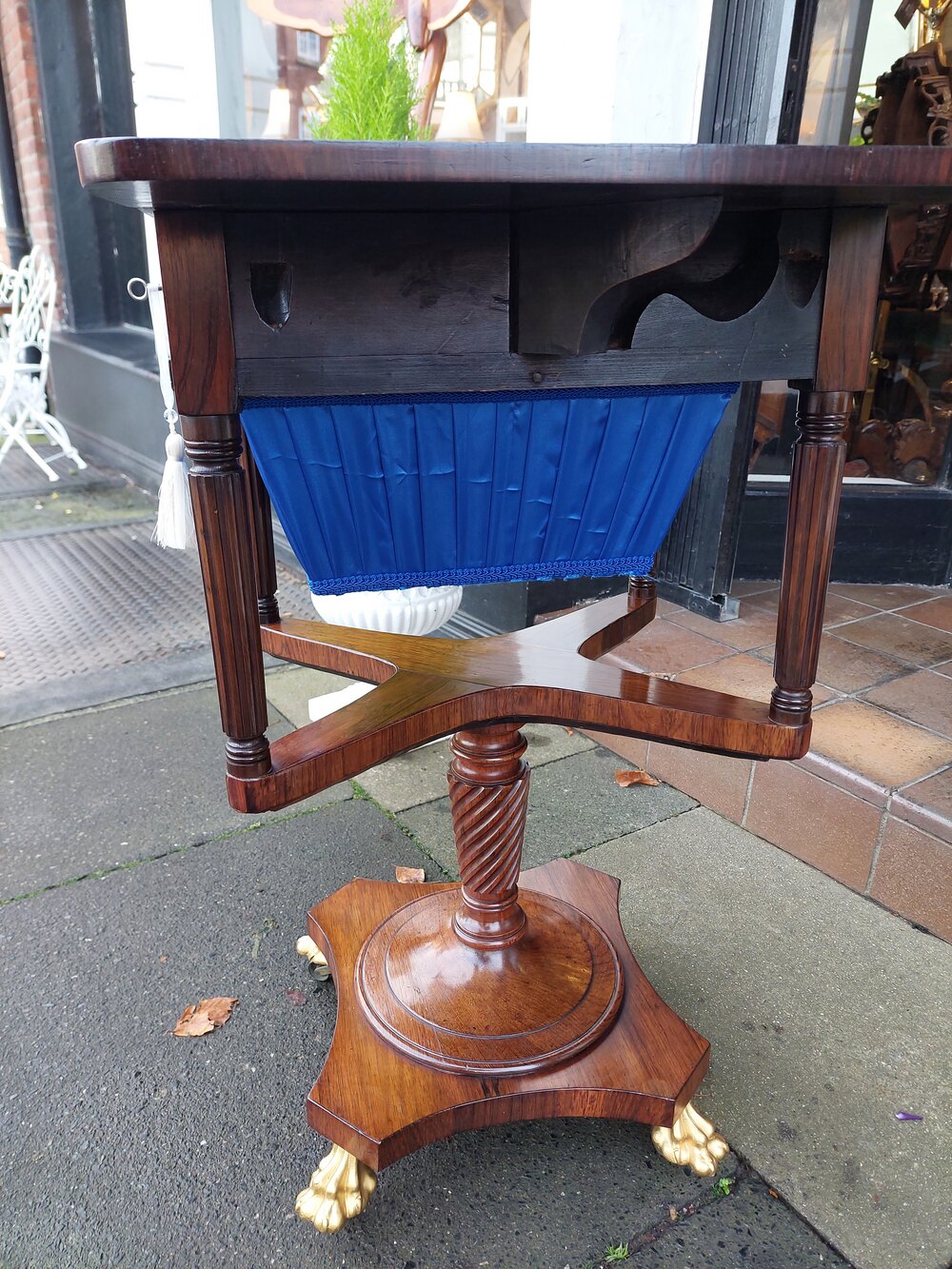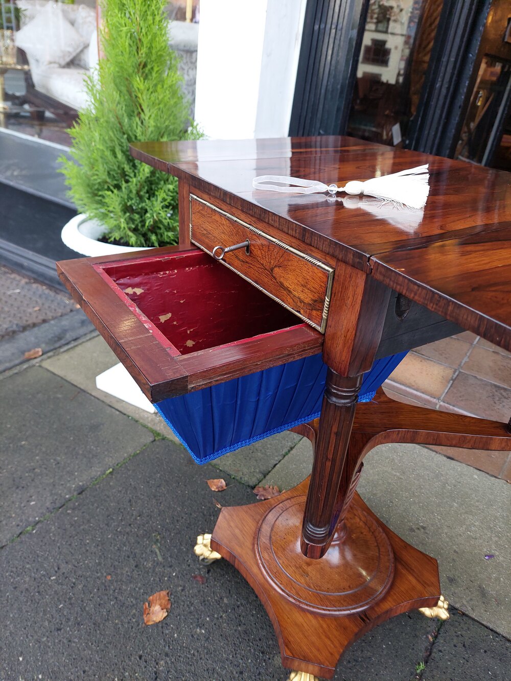 Regency Brass Inlaid Rosewood Work Table - the rectangular twin-flap top above a frieze drawer with brass edging, over a fitted workbox, raised on a turned spiral column and quatrefoil platform base with brass paw feet and castors - 15"w (28" open) x 17"d x 31"hDateRegency
