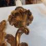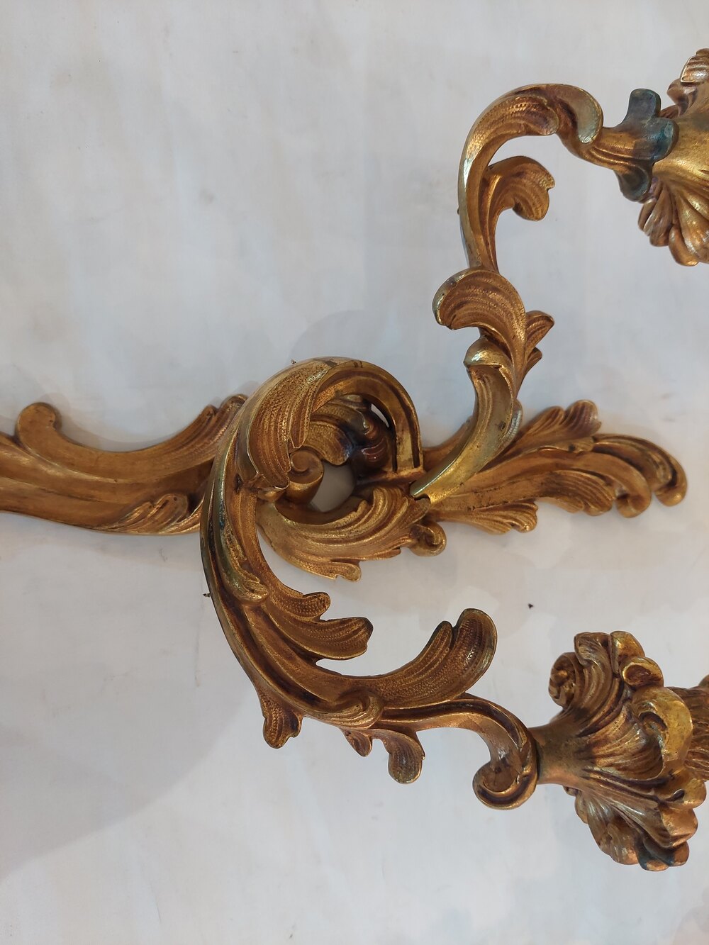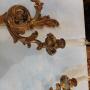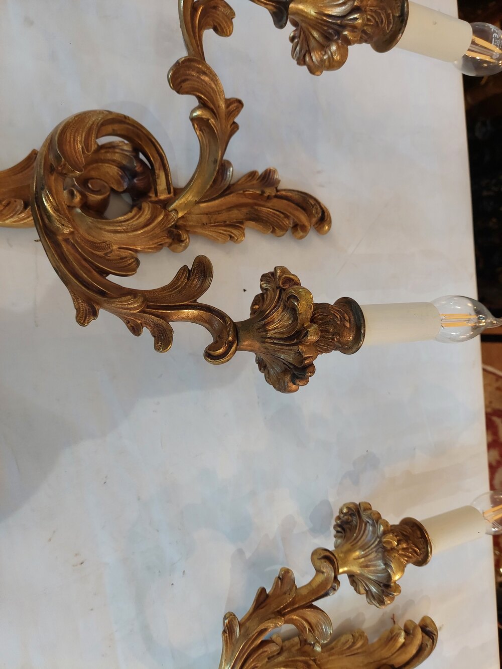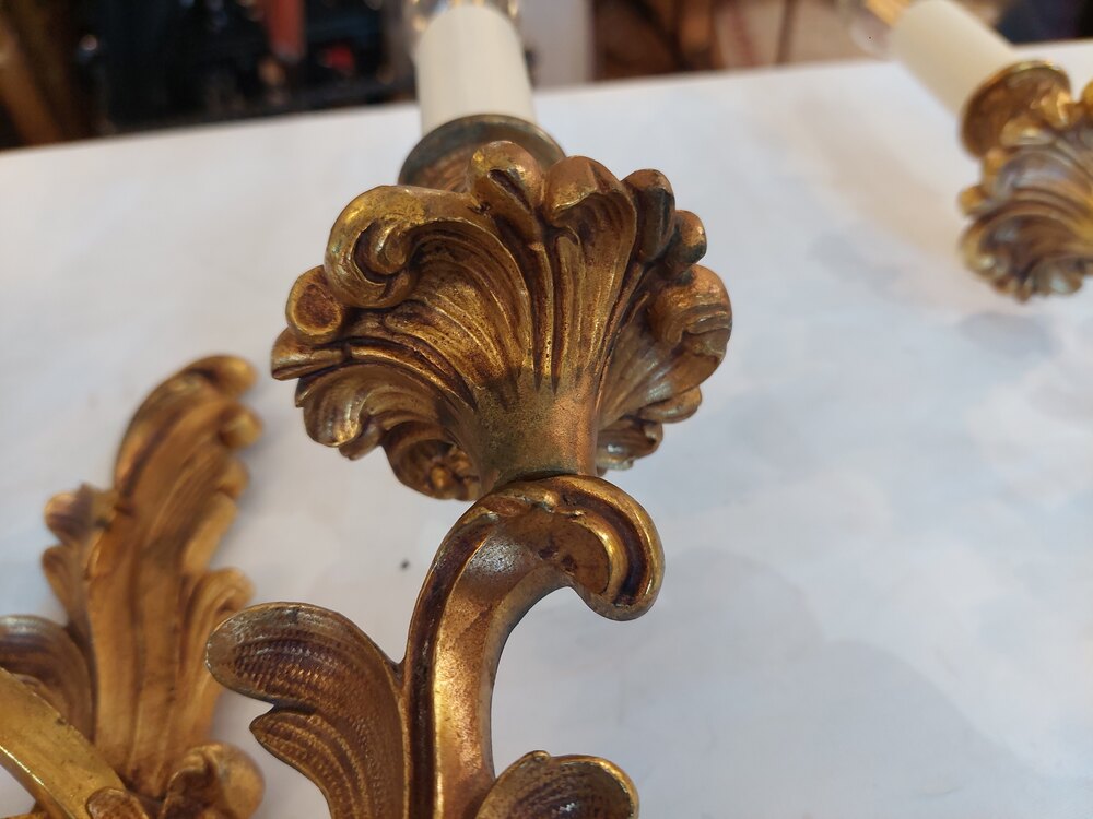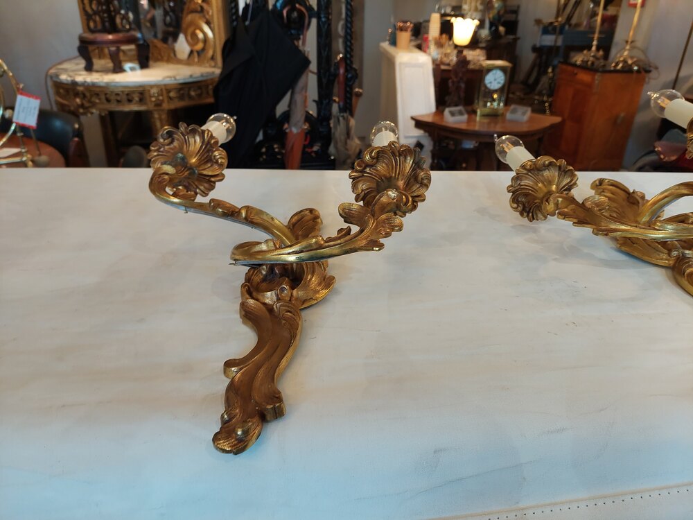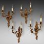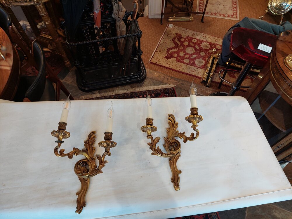 Set of Four Early 20thC Brass Rococo Style Wall Lights - 2 branches supporting Candle Bulb Holders - 10.5"w x 4.5"d x 17"h - all lights and lamps have been rewired with authentic corded flex, fitted with either foot switch or finger clicker switch and are Pat testedDateEarly 20th Century