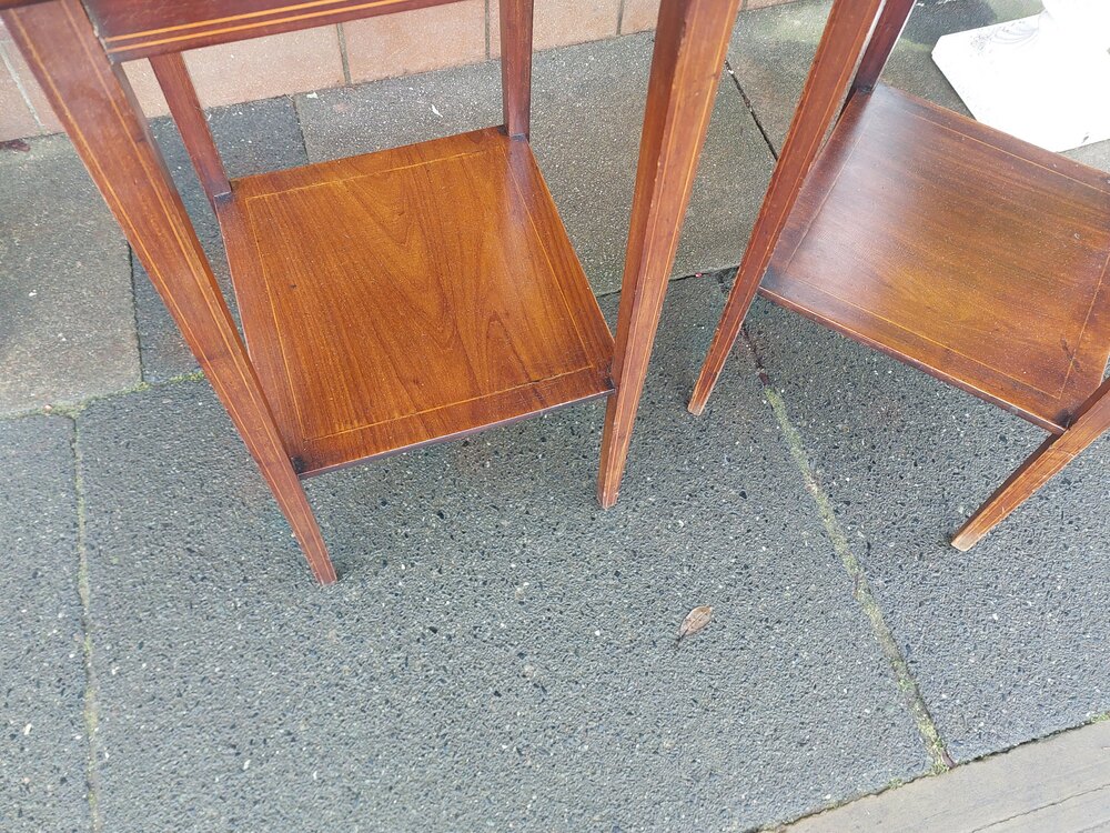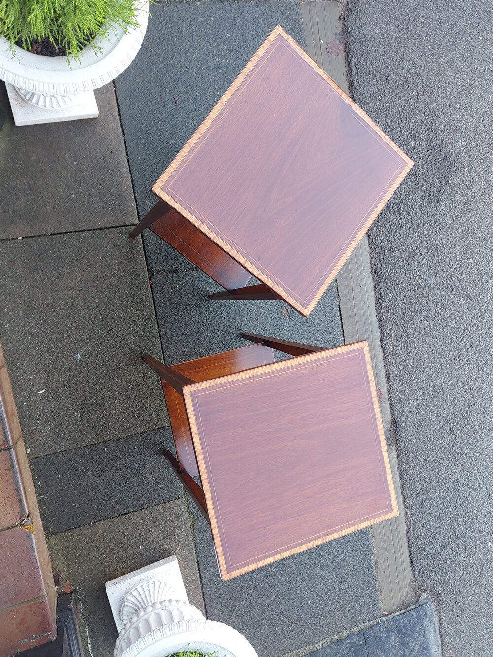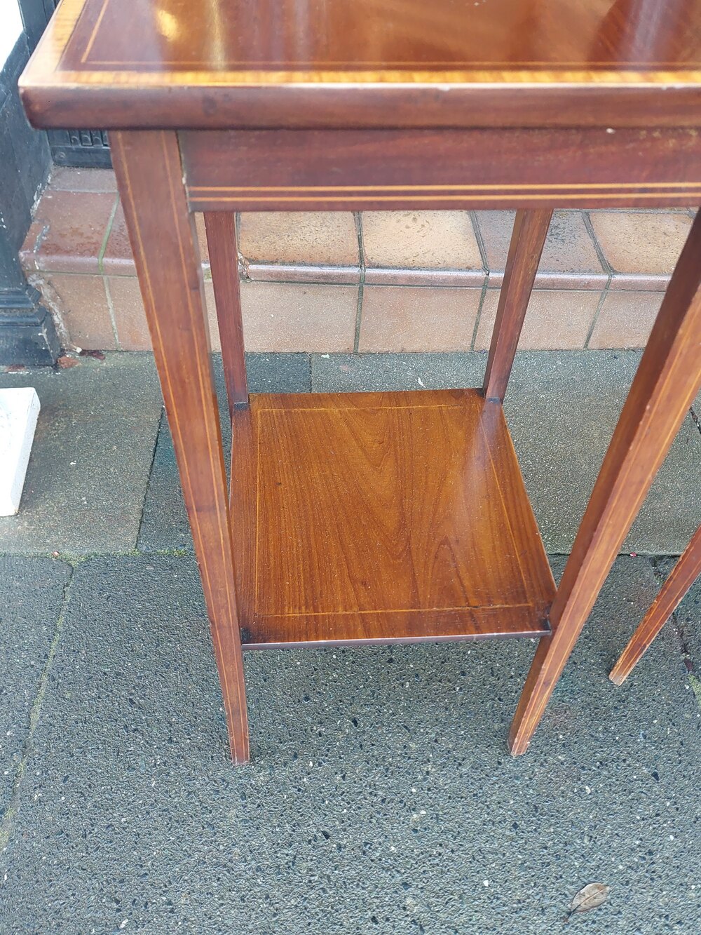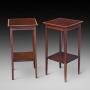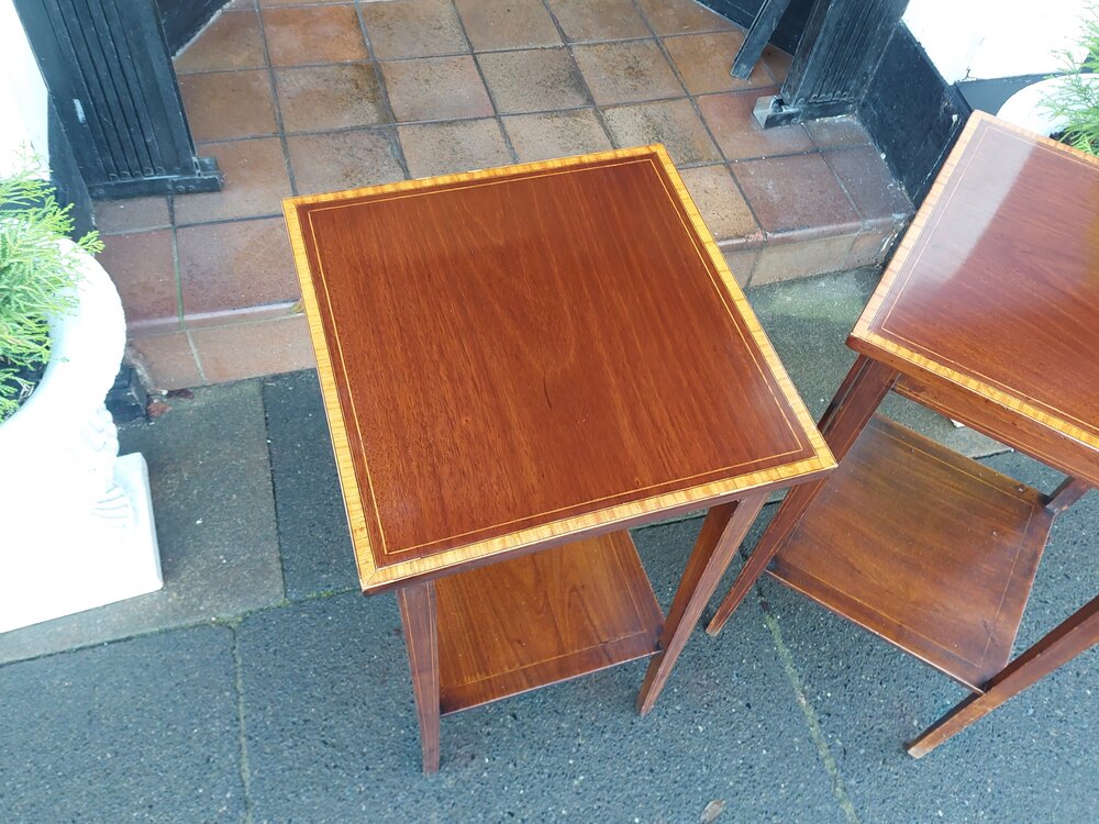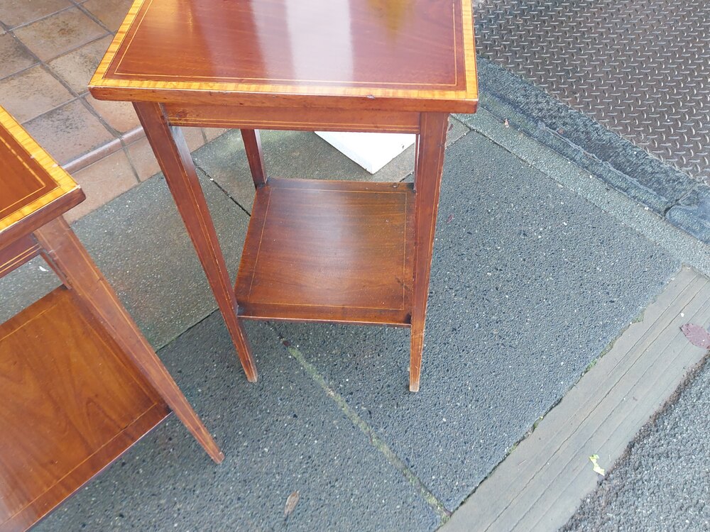 Pair of Edwardian Inlaid Mahogany End Tables - the two tier occasional tables with square tapered legs in the Sheraton manner - 14" x 14" x 28"hDateEdwardian